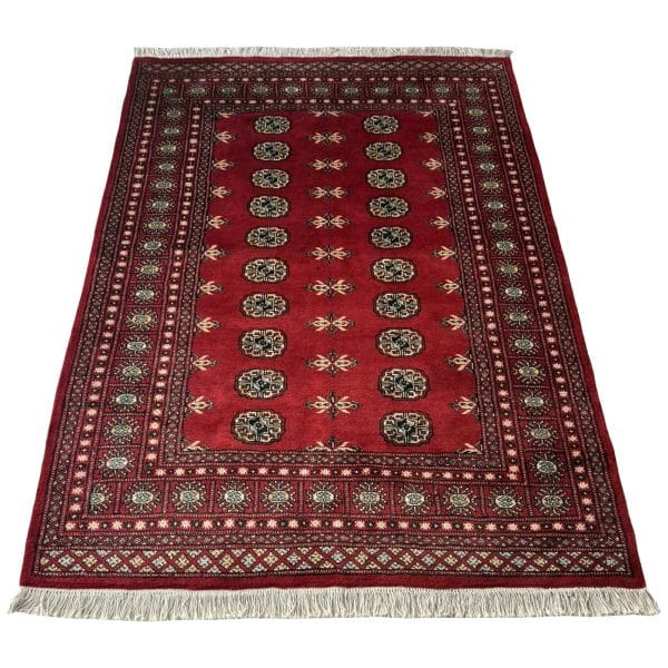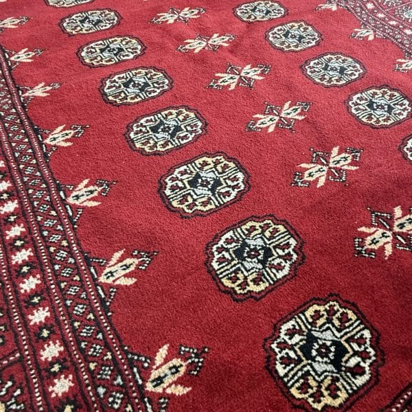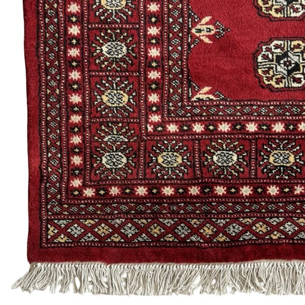 The Bokhara Karachi rug is a stunning hand-knotted piece that showcases traditional craftsmanship and timeless beauty. Characterized by its rich, deep colors—often featuring reds, blacks, and earthy tones—this rug typically displays intricate geometric patterns and floral motifs inspired by the historic Bokhara style.