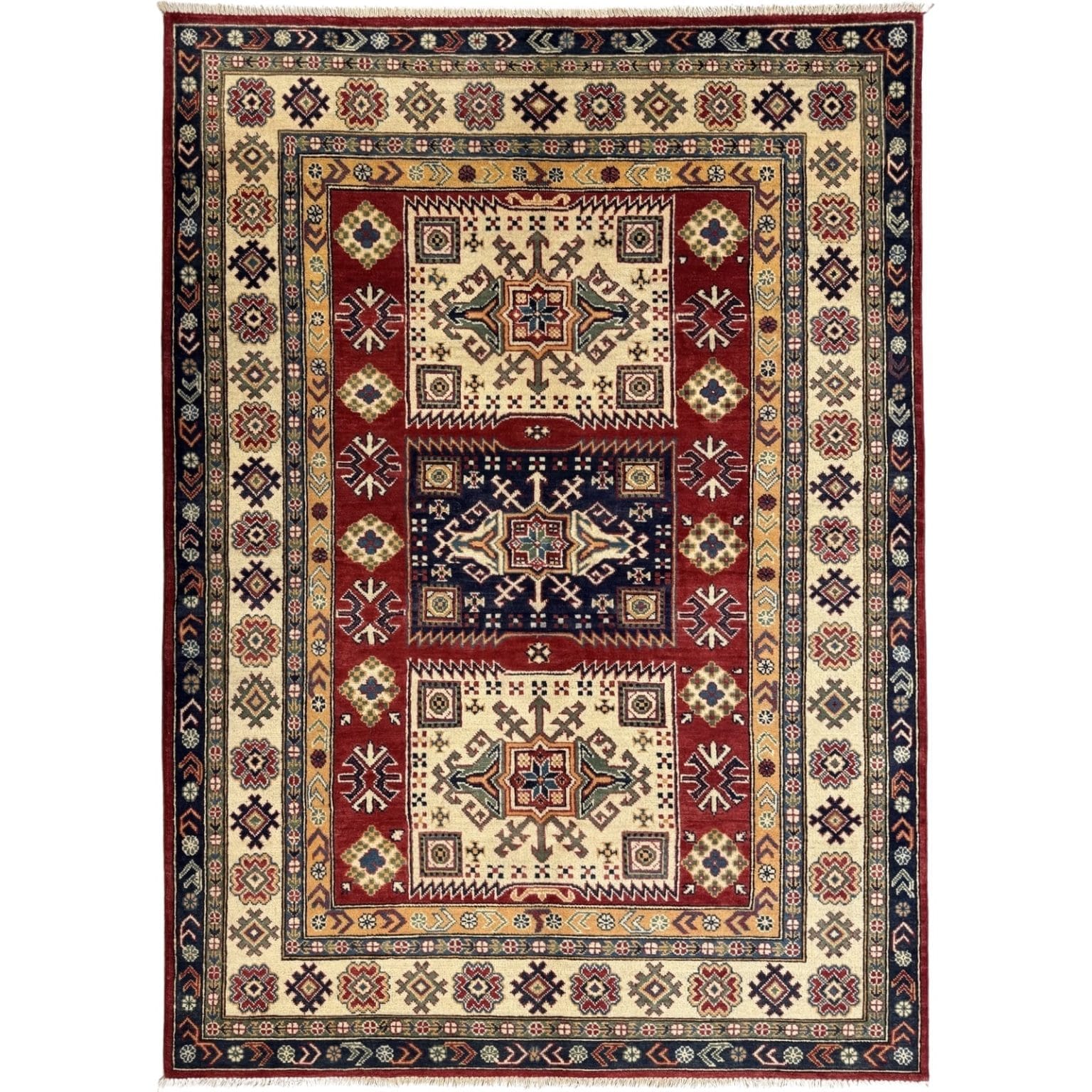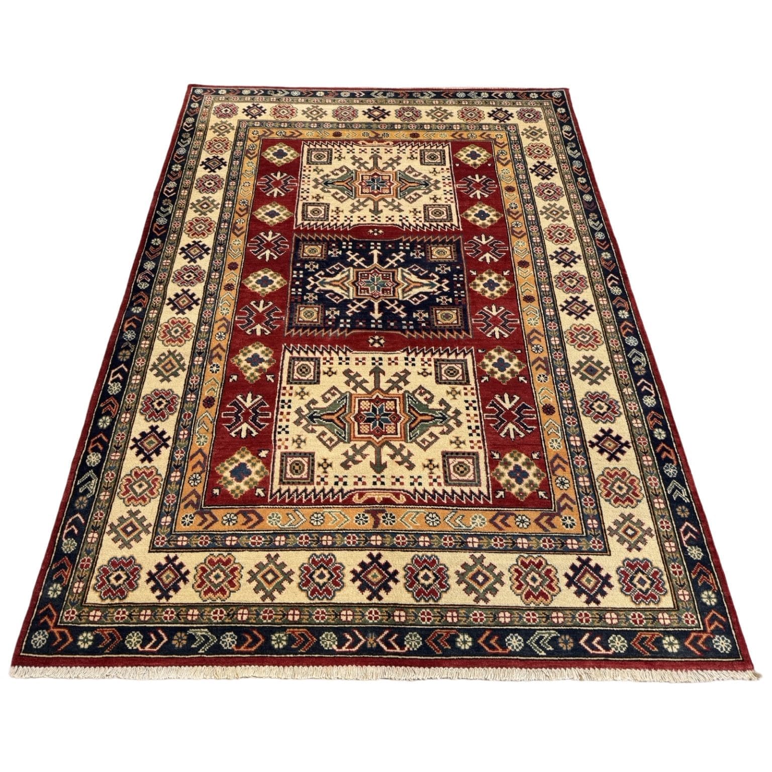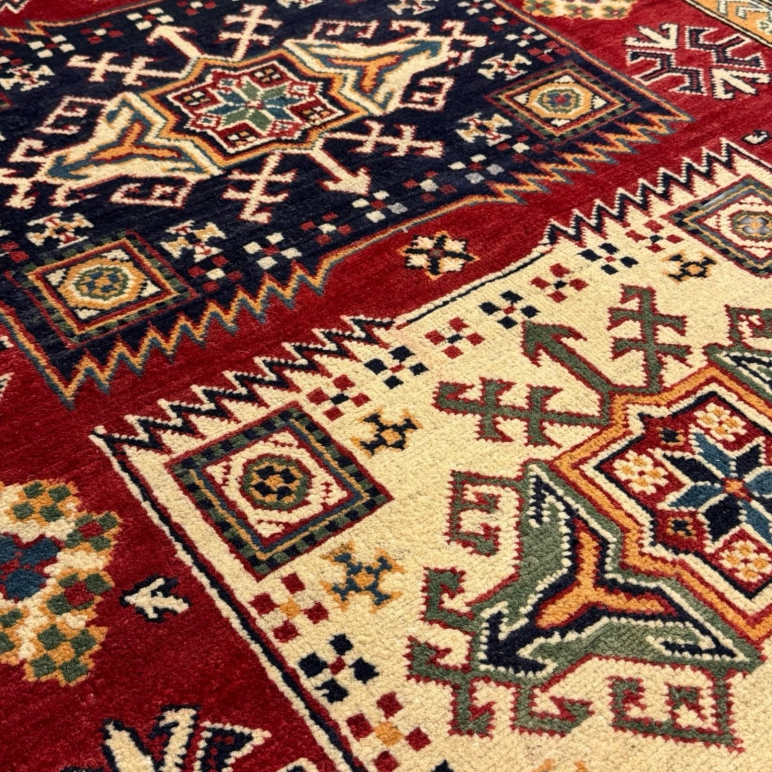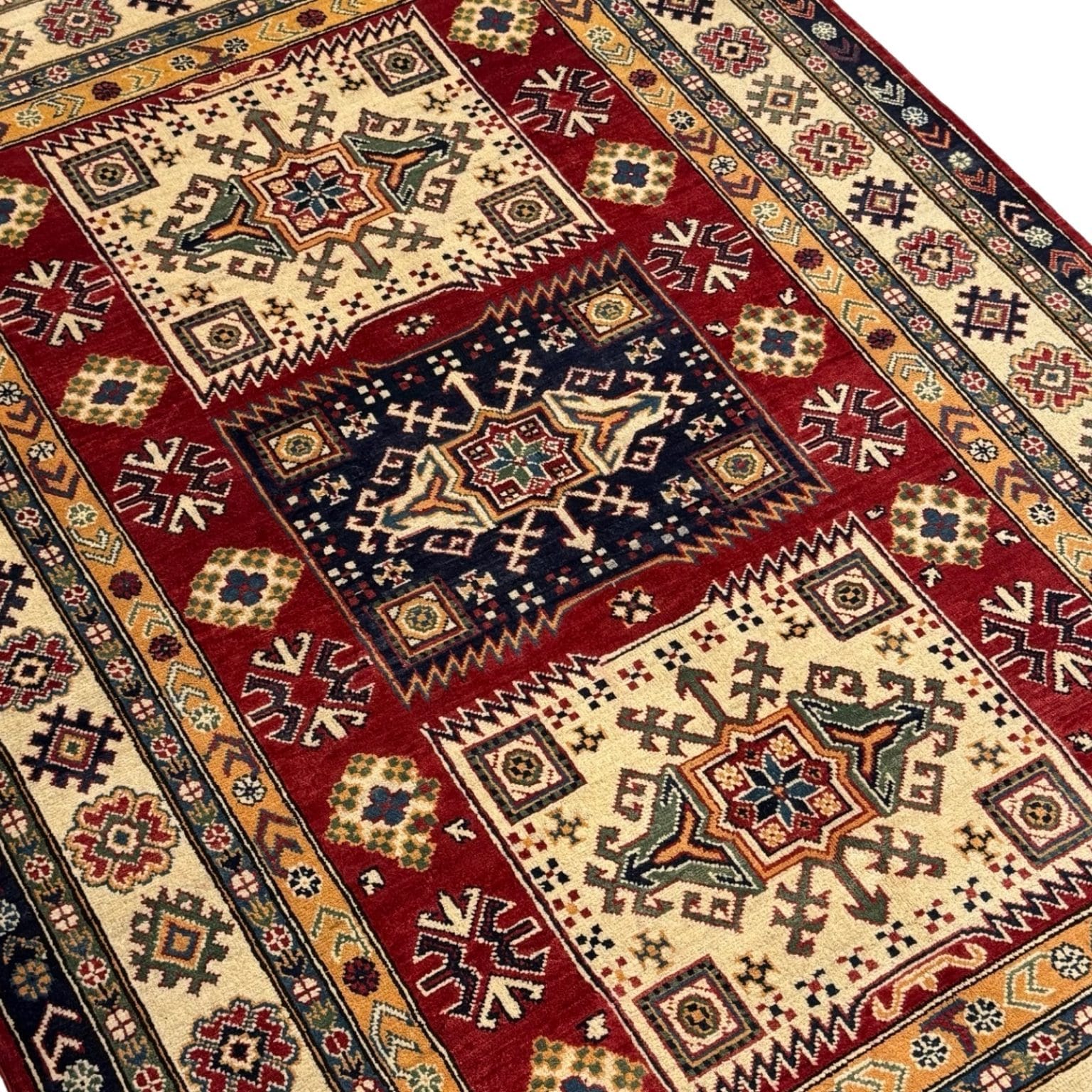 The Afghan Kazak rug is a hand-knotted treasure known for its bold geometric designs and vibrant colors. Made using traditional techniques and high-quality wool, this rug showcases the rich cultural heritage of the Caucasus region, offering durability and a striking aesthetic that enhances any space.