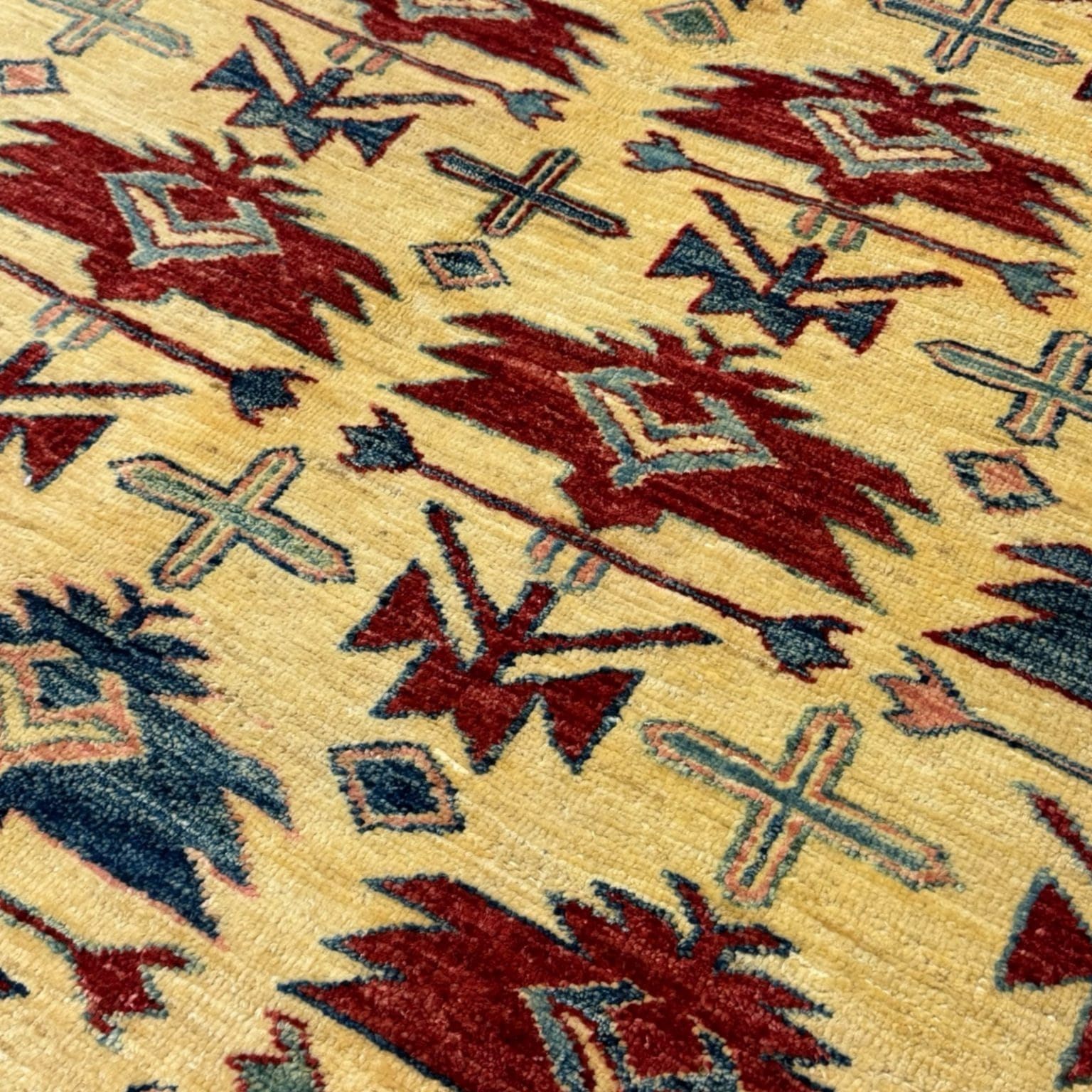 The Afghan Kazak rug is a hand-knotted treasure known for its bold geometric designs and vibrant colors. Made using traditional techniques and high-quality wool, this rug showcases the rich cultural heritage of the Caucasus region, offering durability and a striking aesthetic that enhances any space.