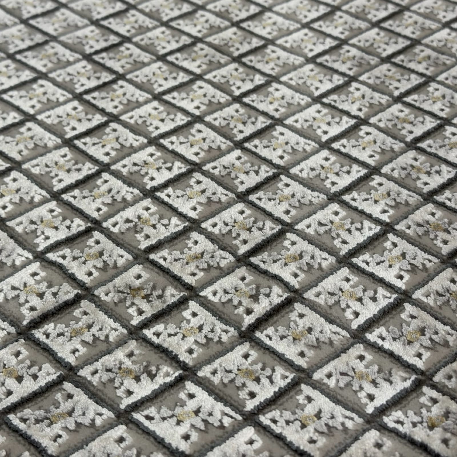 This rug features a refined all-over geometric grid, framed by a detailed traditional border that adds depth without overpowering the design. The subtle contrast between light grey and darker charcoal tones gives it a calm, balanced look that works well in modern, minimalist, or transitional interiors.