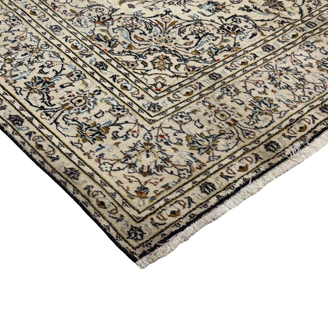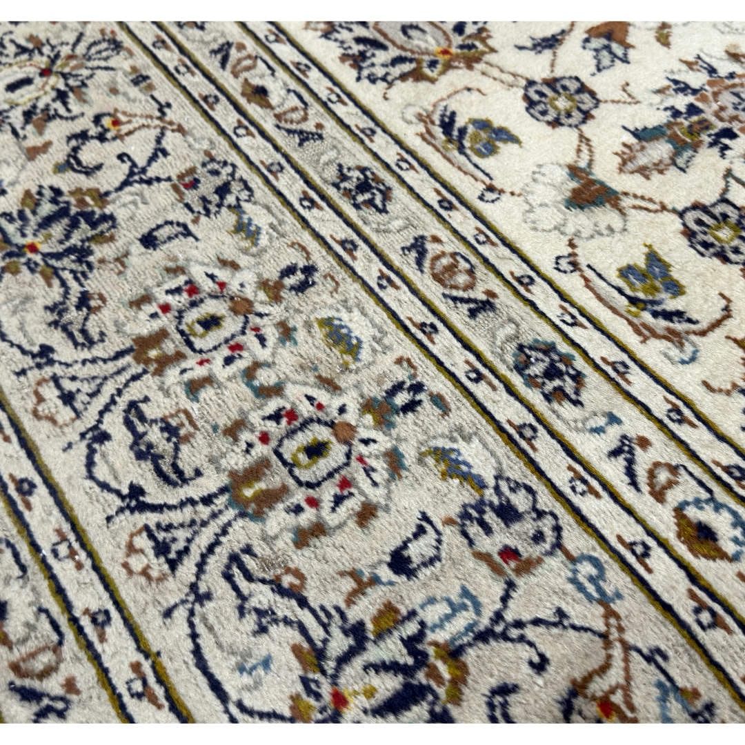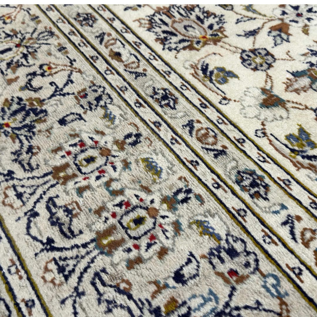 Classic Kashan rug featuring an elegant ivory field with finely detailed floral and vine motifs throughout. The soft palette of beige, navy, light blue and subtle earthy accents gives it a calm, timeless look. Hand-knotted with quality Persian wool on a strong cotton foundation, this rug is durable, well-balanced and ideal for adding refined Persian character to any space.