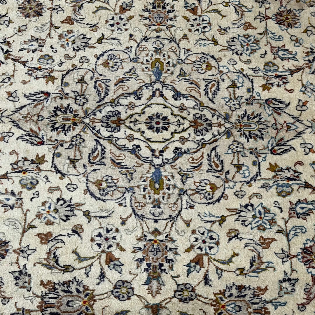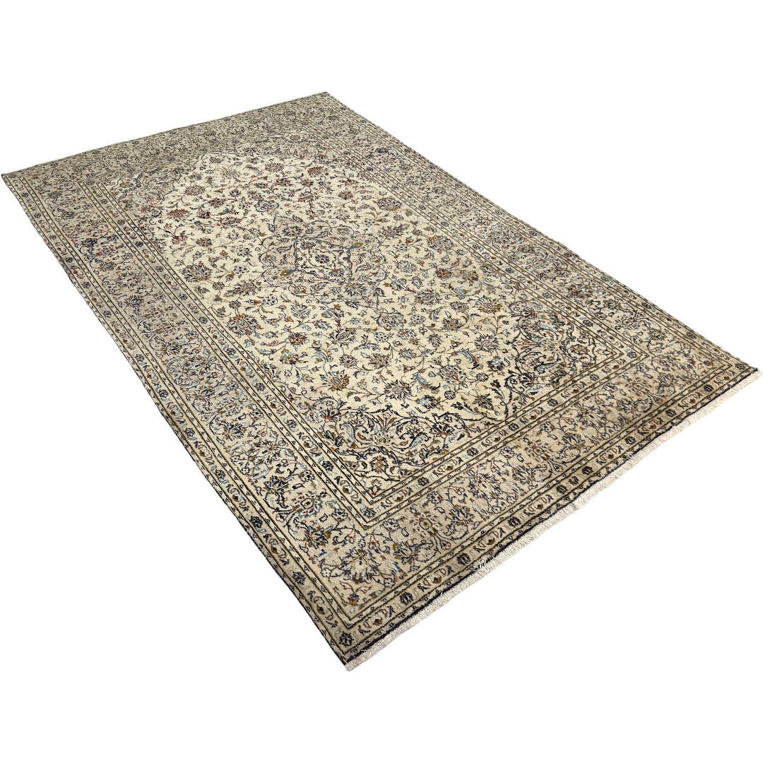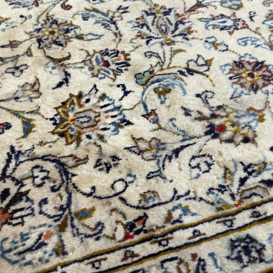 Classic Kashan rug featuring an elegant ivory field with finely detailed floral and vine motifs throughout. The soft palette of beige, navy, light blue and subtle earthy accents gives it a calm, timeless look. Hand-knotted with quality Persian wool on a strong cotton foundation, this rug is durable, well-balanced and ideal for adding refined Persian character to any space.