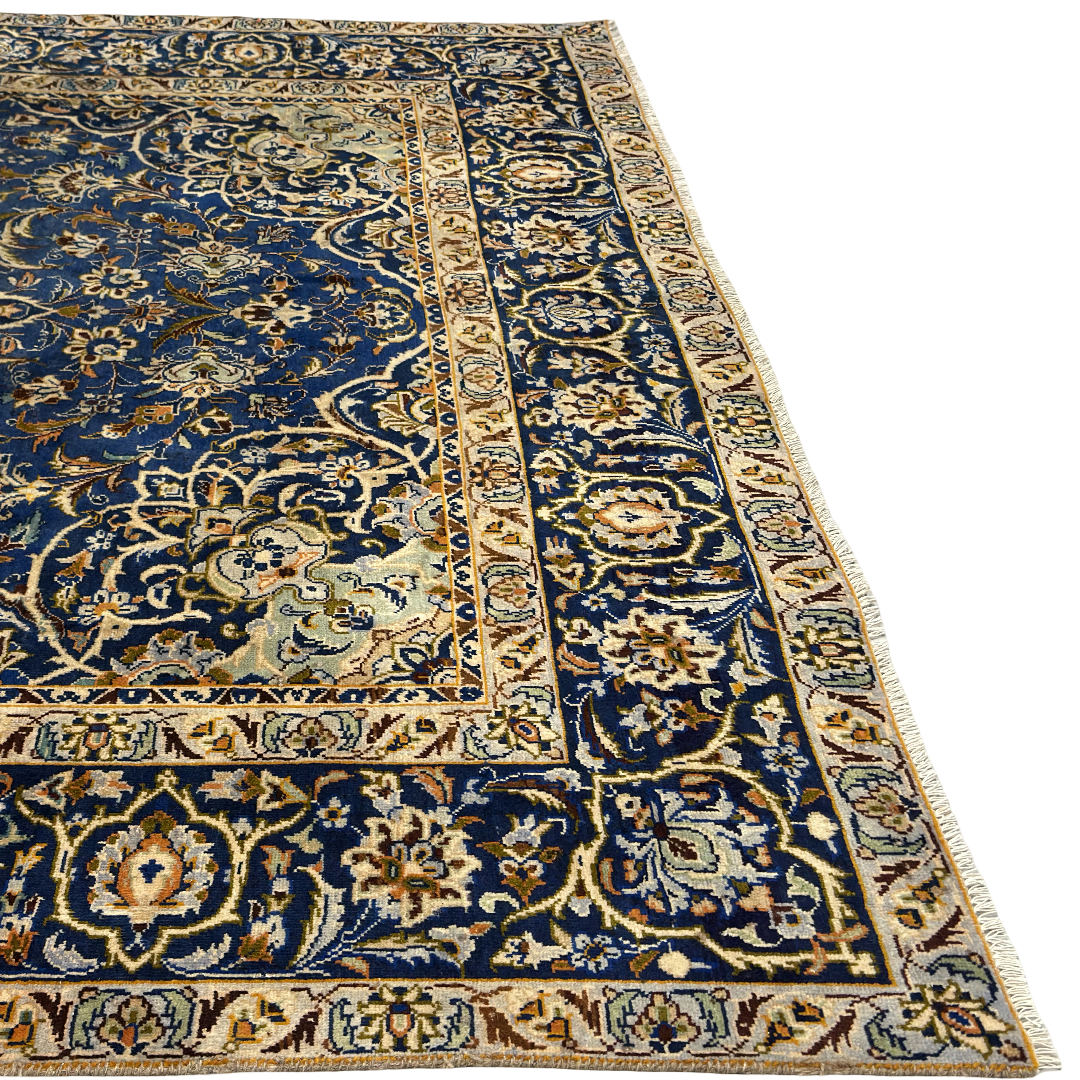 Add a statement of timeless elegance to your home with this exquisite vintage Kashan Persian rug. Hand knotted with precision, this piece showcases a rich royal blue field adorned with an intricate central medallion and beautifully detailed floral motifs—hallmarks of classic Kashan design.