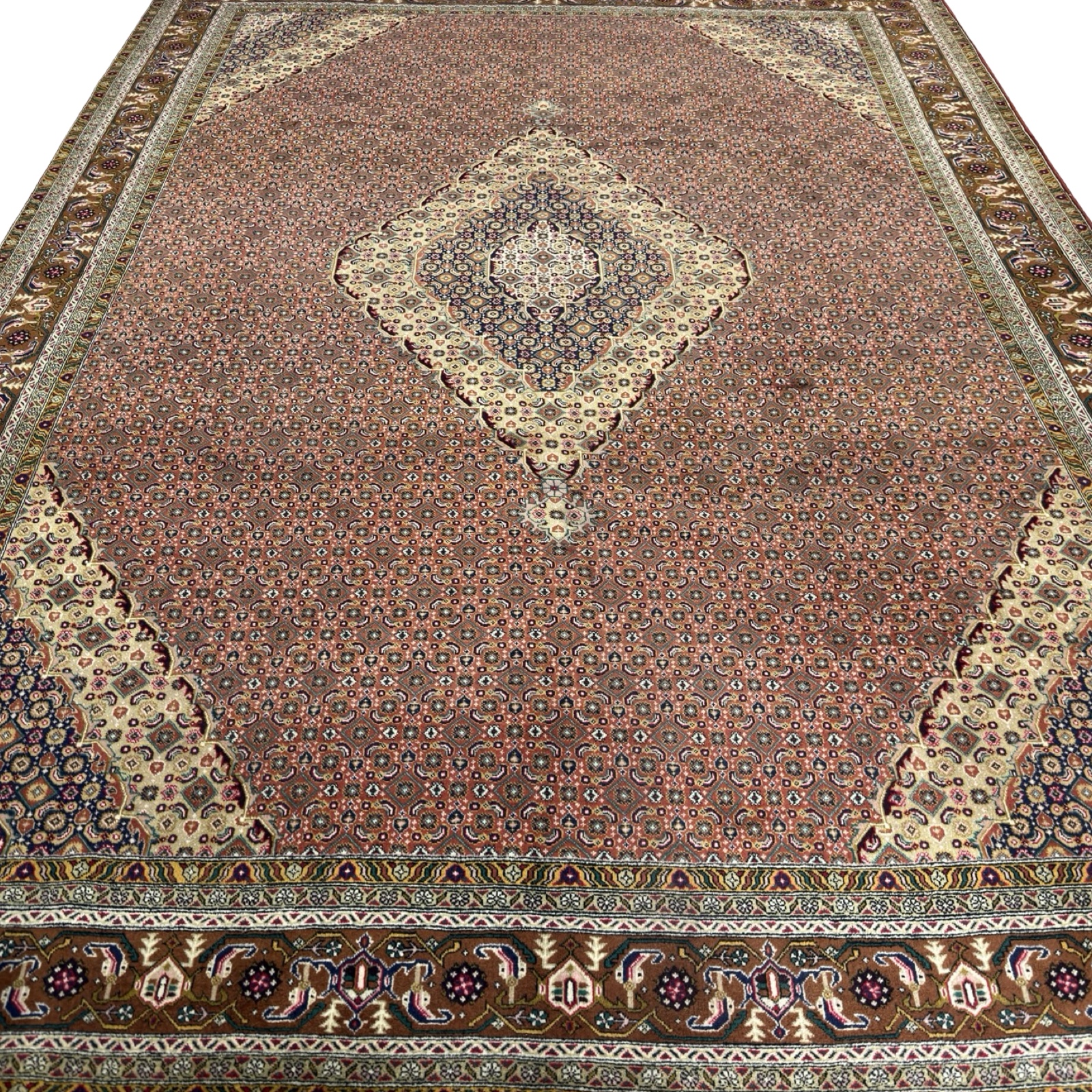 This is a fine Persian Bijar (Bidjar) hand-knotted rug from western Iran, measuring 340 × 250 cm. Bijar rugs are renowned for their exceptional density and strength and are often referred to as the “iron rugs of Persia.” This piece clearly shows that character, with a compact, tightly packed pile and a firm handle that gives the rug a solid, substantial feel. Unlike Hamadan rugs, which tend to be looser in structure, this rug is dense and highly durable.