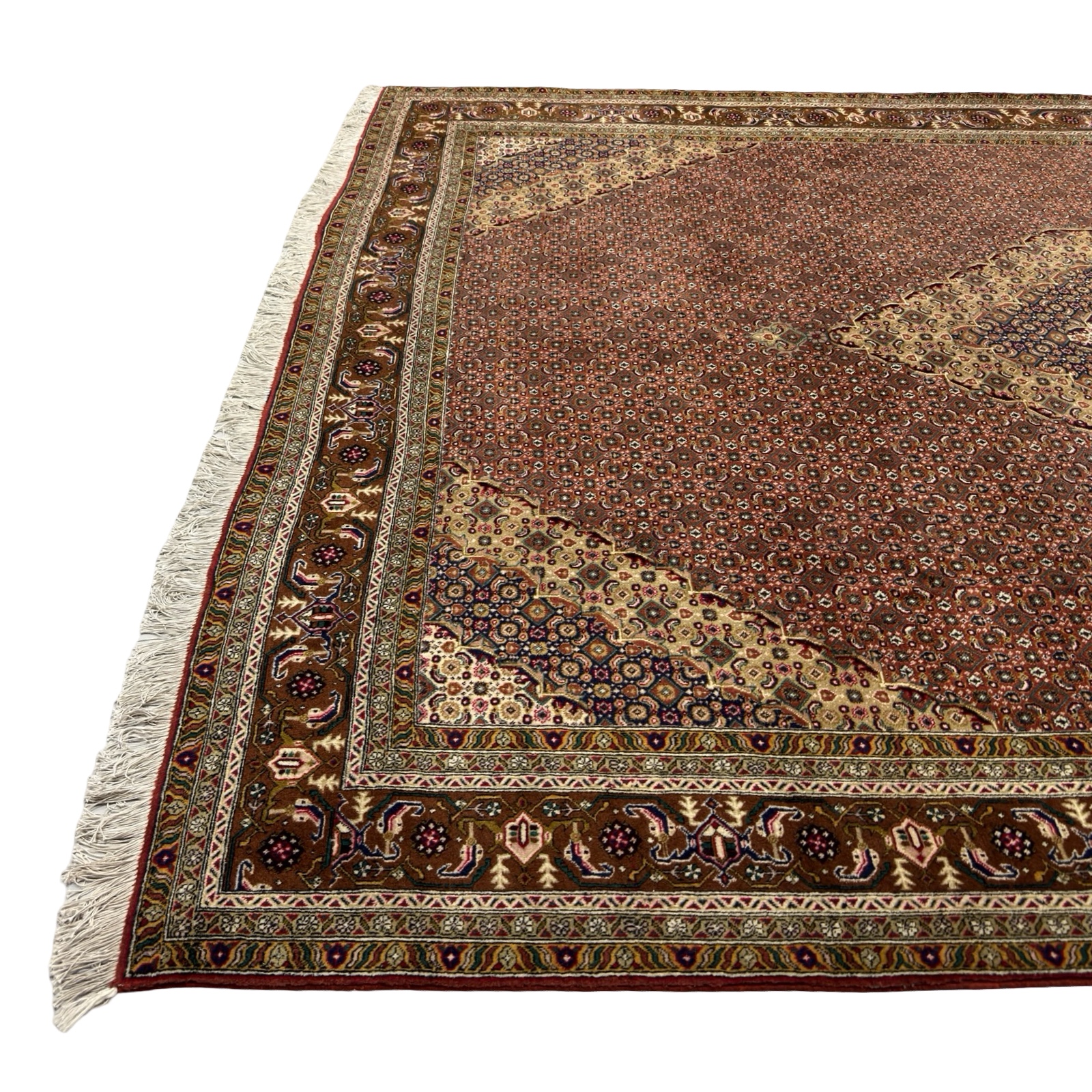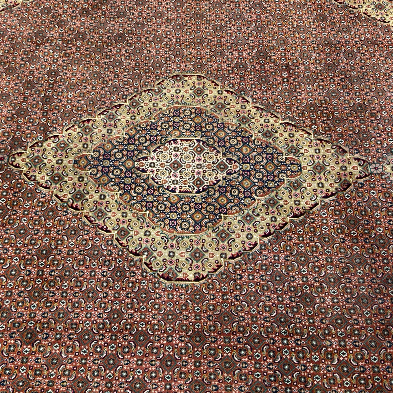 The design features a classic Herati (mahi) field in a warm brick-red tone, filled with small repeating floral motifs that create depth and visual movement. A layered diamond medallion anchors the center, executed in ivory, navy, and muted green, offering contrast while staying balanced and refined. The wide border is richly detailed with geometric and floral elements typical of high-quality Bijar weaving.