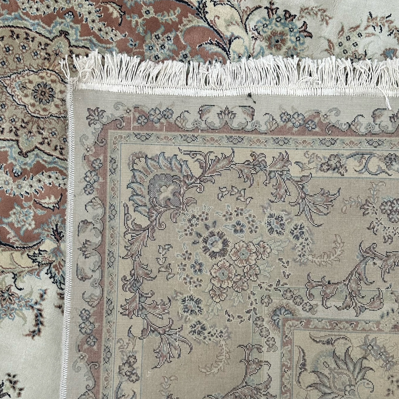 Finished with hand-detailed decorative fringes, it offers the charm of a classic Persian rug with the durability and easy care of modern production. Suitable for living rooms, dining areas, and bedrooms.