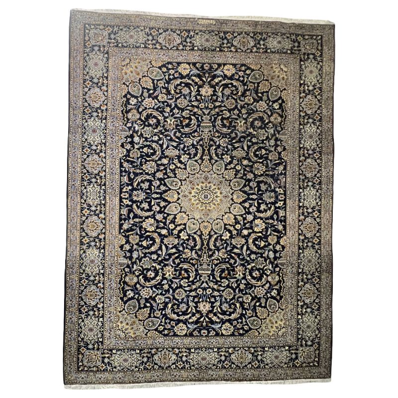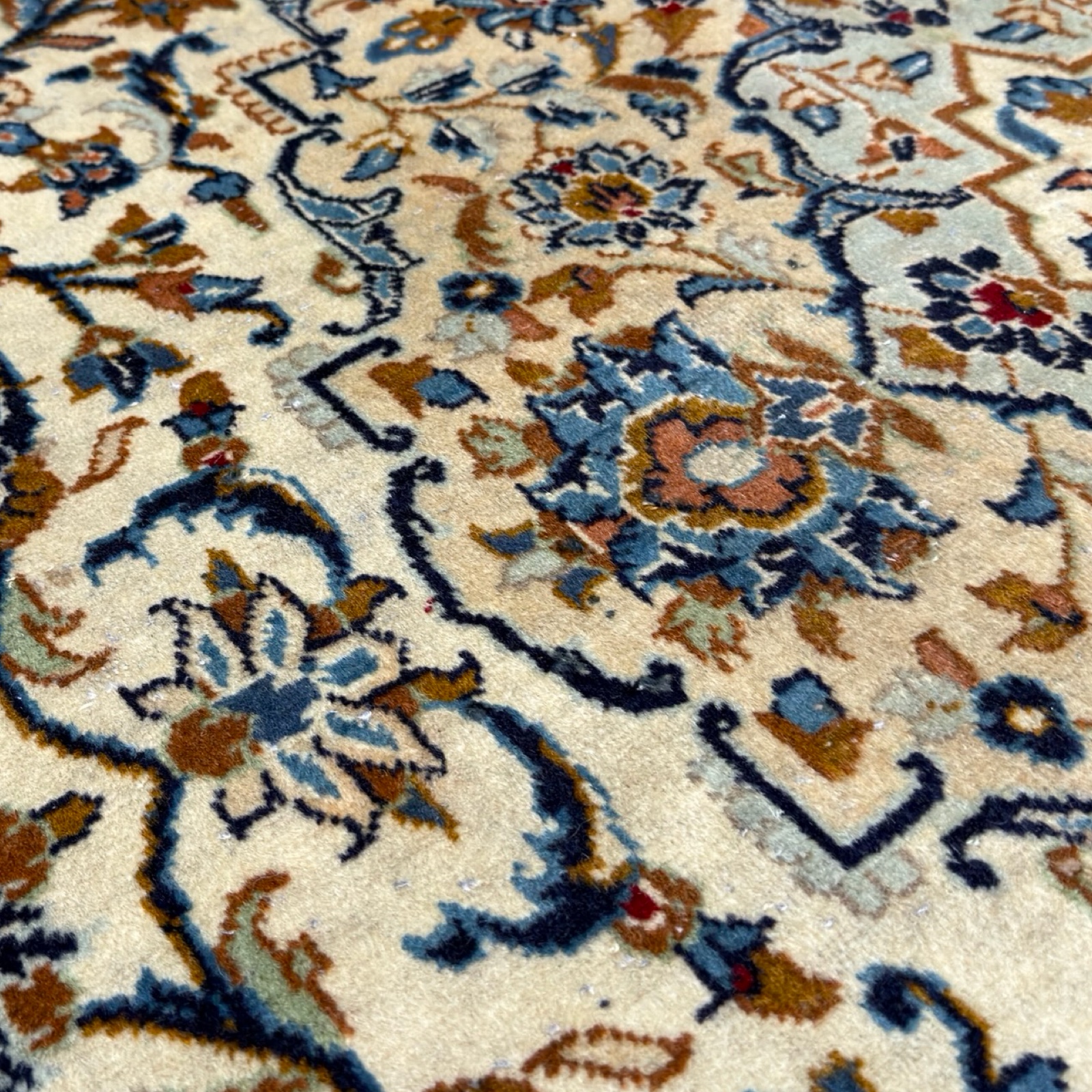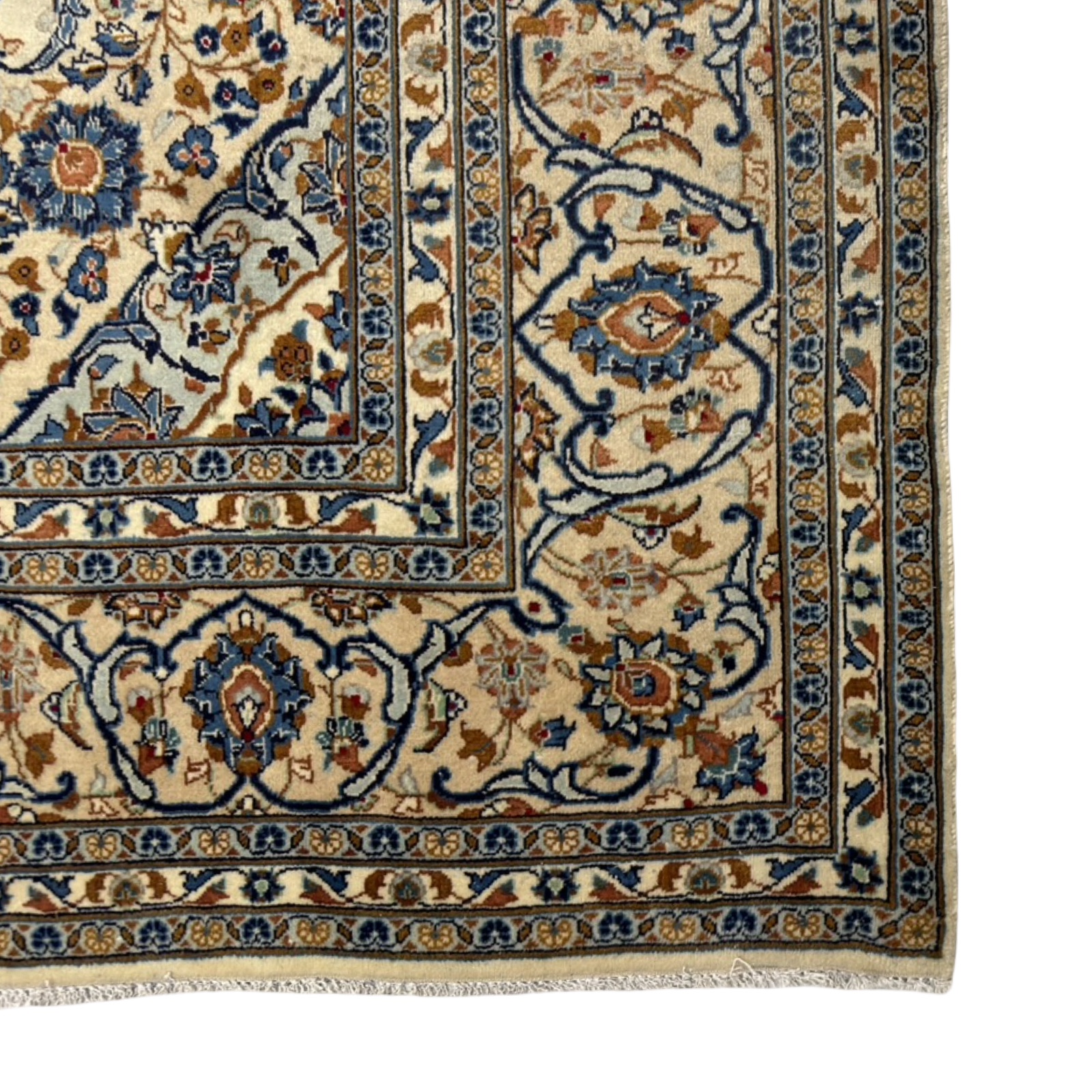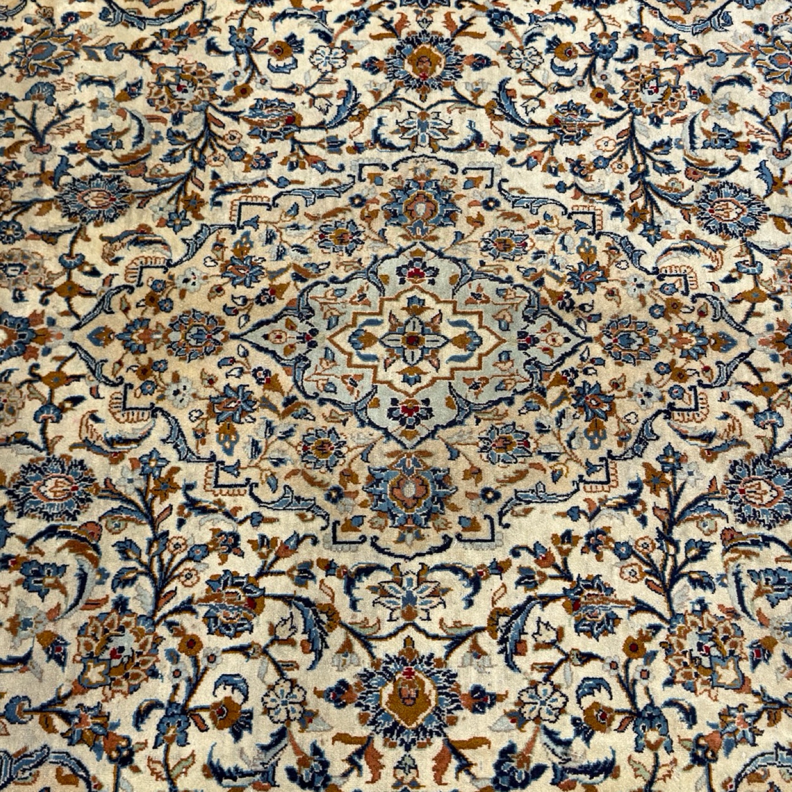 This is a finely woven Kashan rug, known for its elegant symmetry and detailed floral composition. The design features a well-defined central medallion set within a densely decorated field of scrolling vines, flowers, and palmettes, all arranged with excellent balance and clarity. The drawing is refined and precise, which is characteristic of quality Kashan workshop weaving.