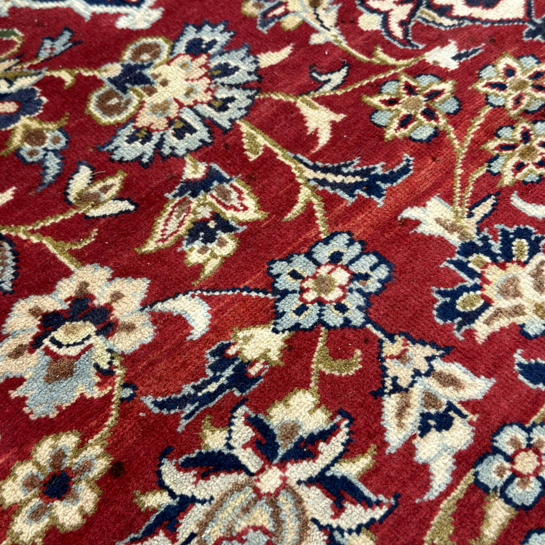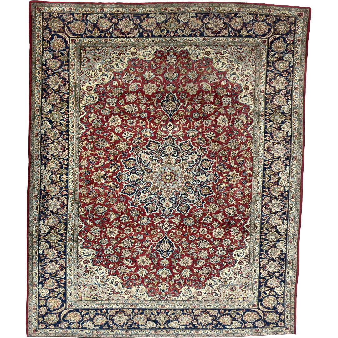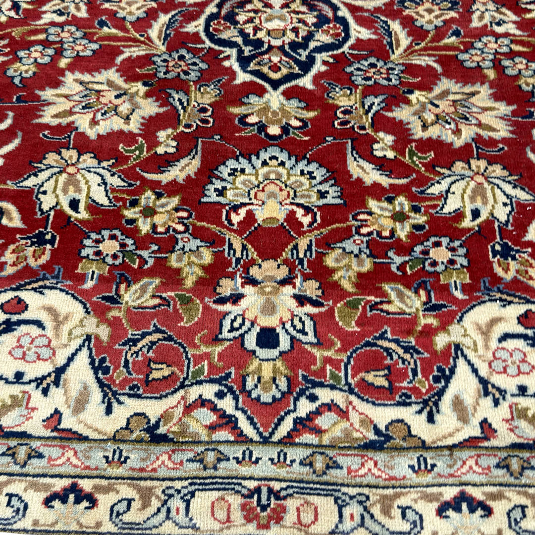 This beautiful Persian Najafabad rug is hand-knotted in Iran, known for its dense floral patterns and durable construction. It features a classic central medallion design on a rich red field, complemented by intricate floral motifs and a deep navy border.