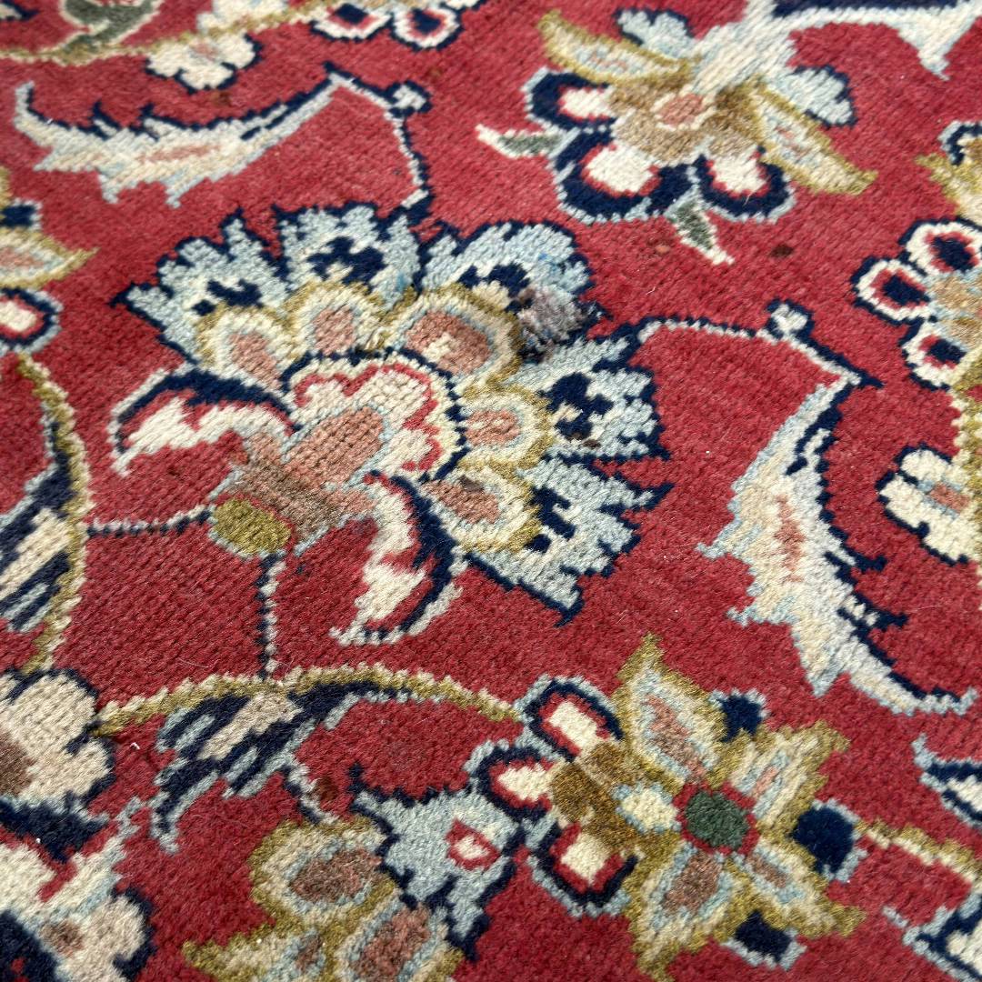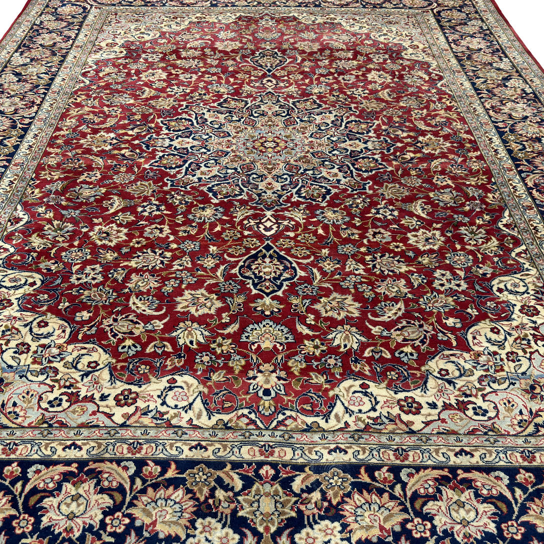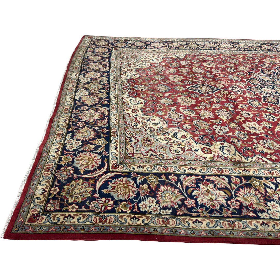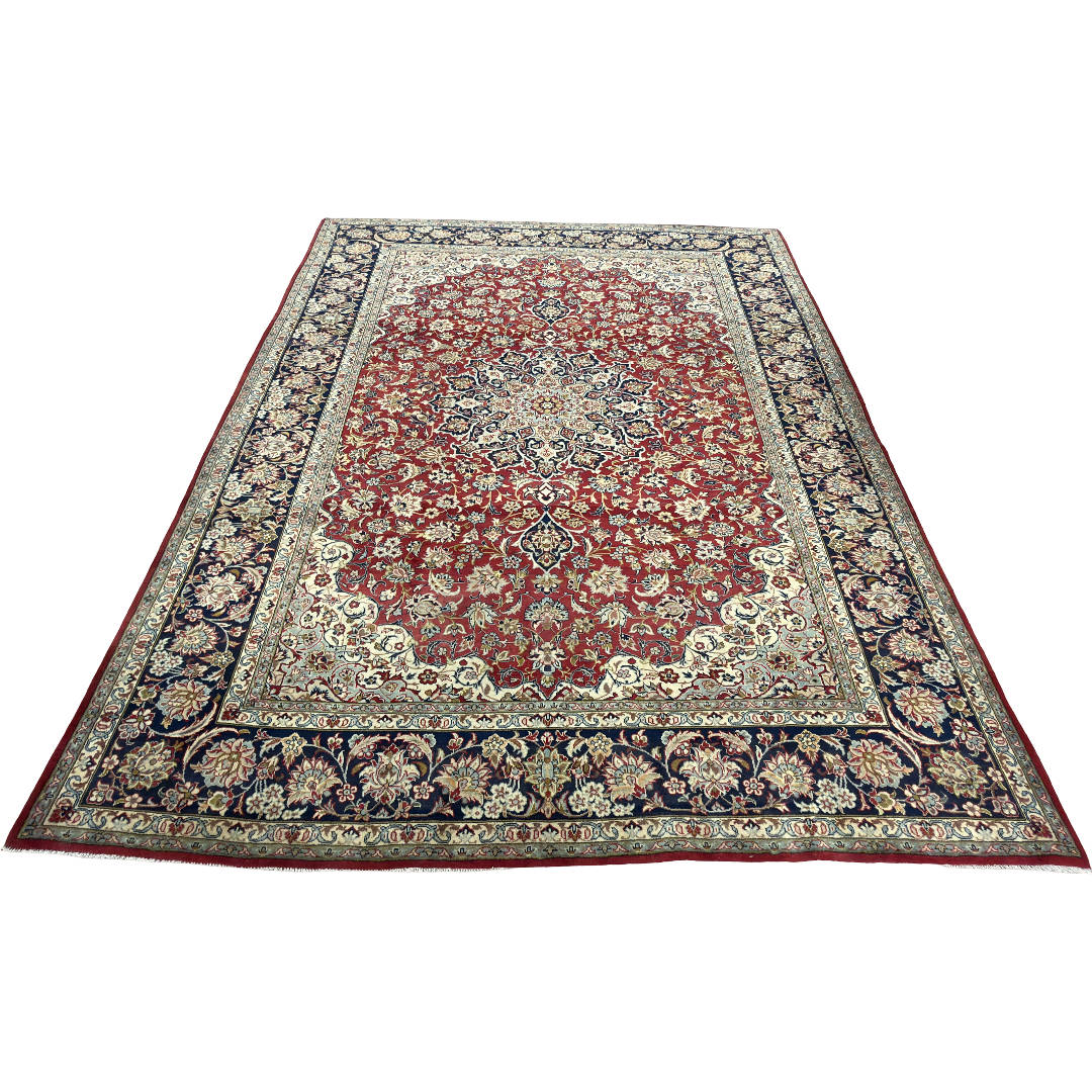 This beautiful Persian Najafabad rug is hand-knotted in Iran, known for its dense floral patterns and durable construction. It features a classic central medallion design on a rich red field, complemented by intricate floral motifs and a deep navy border.