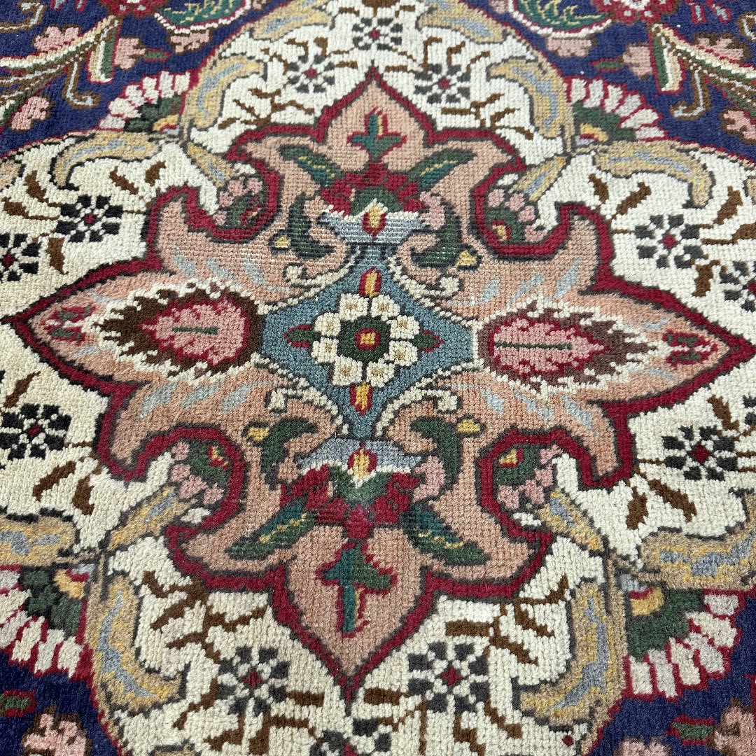 This is a hand-knotted Tabriz floral rug, woven with fine detail and excellent balance. The design is classic and symmetrical, centred around a bold medallion with flowing floral vines that spread evenly across the field. The knotting is tight and precise, giving the rug a crisp pattern definition and a smooth, refined surface underfoot. Made entirely from high-quality wool, it has a rich, natural sheen and strong durability, suitable for both formal living areas and elegant everyday spaces. The craftsmanship reflects the long Tabriz weaving tradition, known for its consistency, strength, and refined artistic finish.