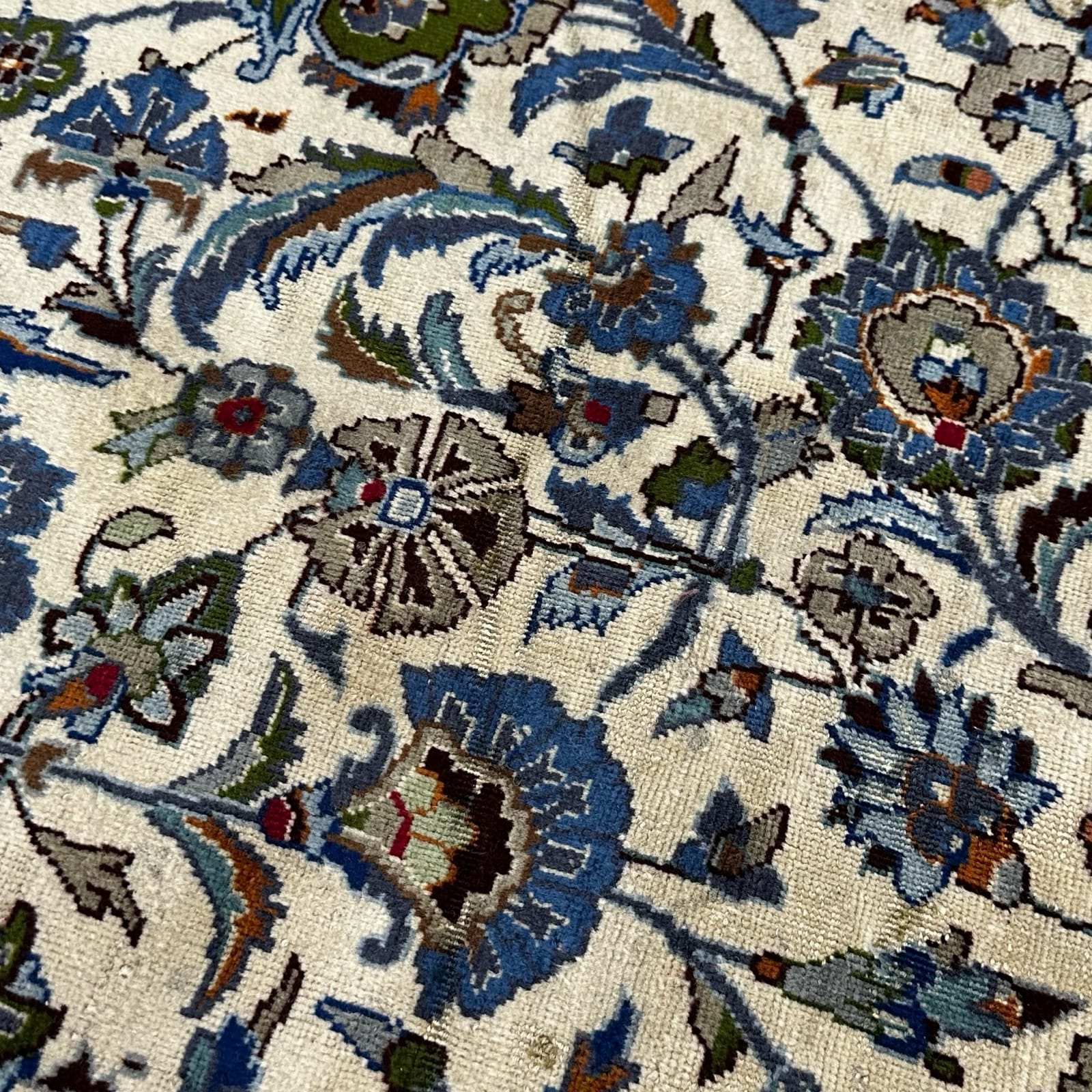 A genuine hand-knotted Persian Kashan rug from Iran, beautifully aged with a soft, time-worn patina that enhances its character and authenticity. The cream field with an intricate medallion and floral motifs in blue, beige, and soft gold is framed by a light green border, giving it a refined yet vintage charm. Its large size (390 x 290 cm) makes it perfect for statement spaces, adding warmth, elegance, and a touch of lived-in luxury to any room.