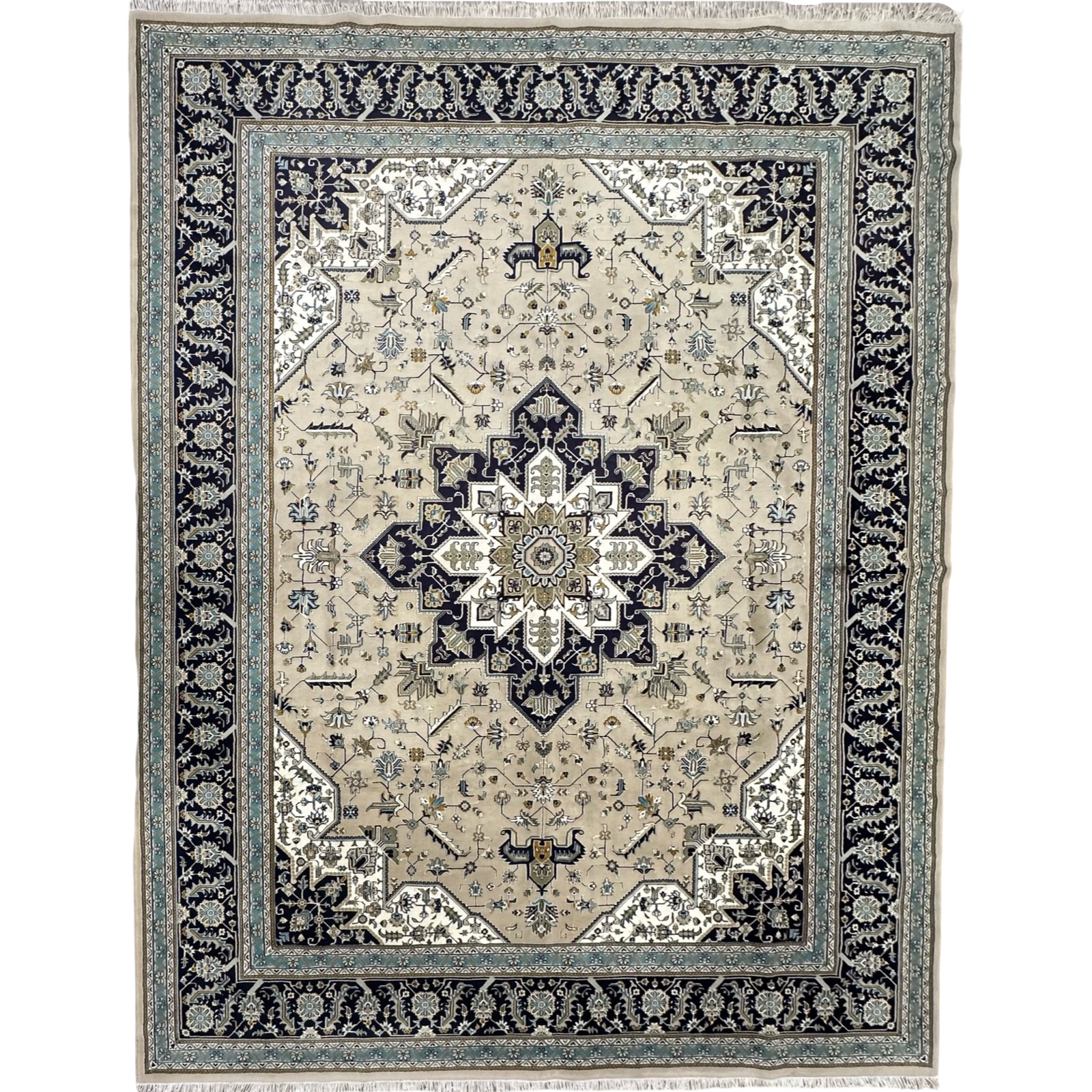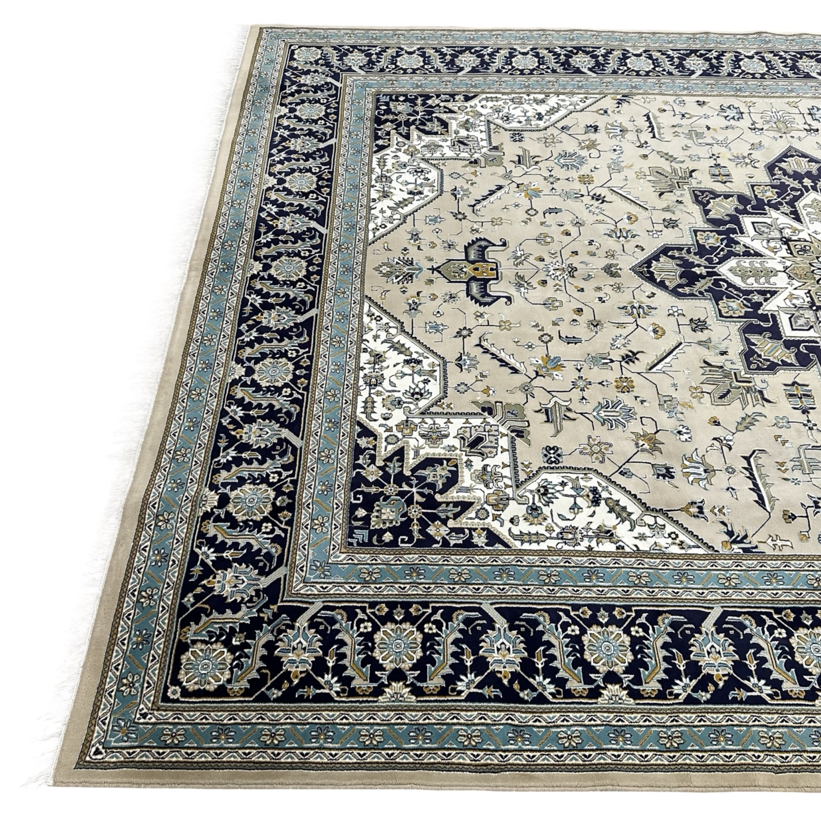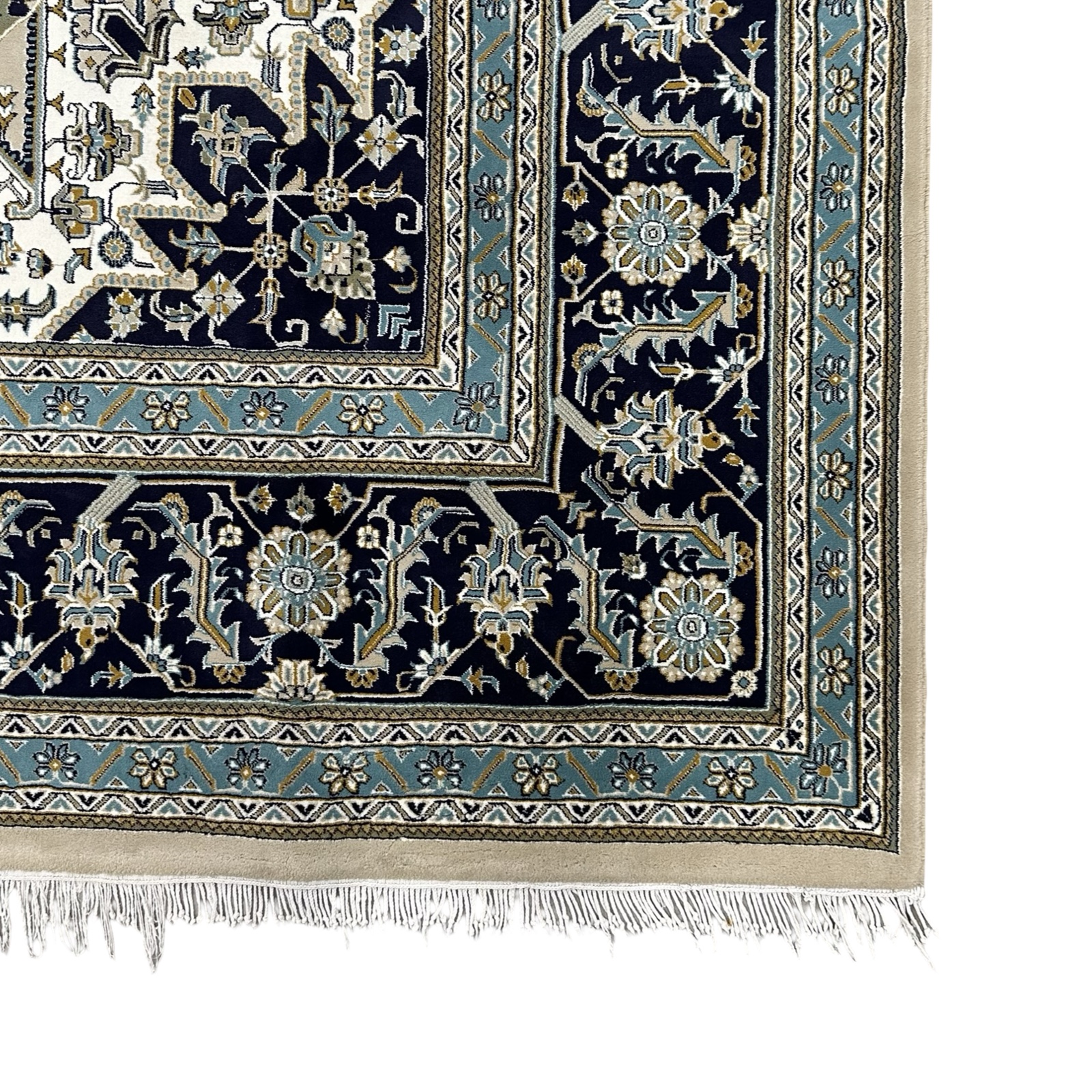 This rug is machine-made in Iran, featuring an elegant Persian medallion design inspired by classic Iranian patterns. It has a soft, comfortable pile and detailed motifs that bring a rich, traditional look to any space.