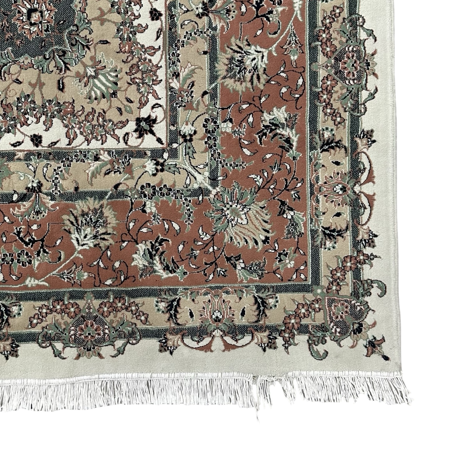 Finished with hand-detailed decorative fringes, it offers the charm of a classic Persian rug with the durability and easy care of modern production. Suitable for living rooms, dining areas, and bedrooms.