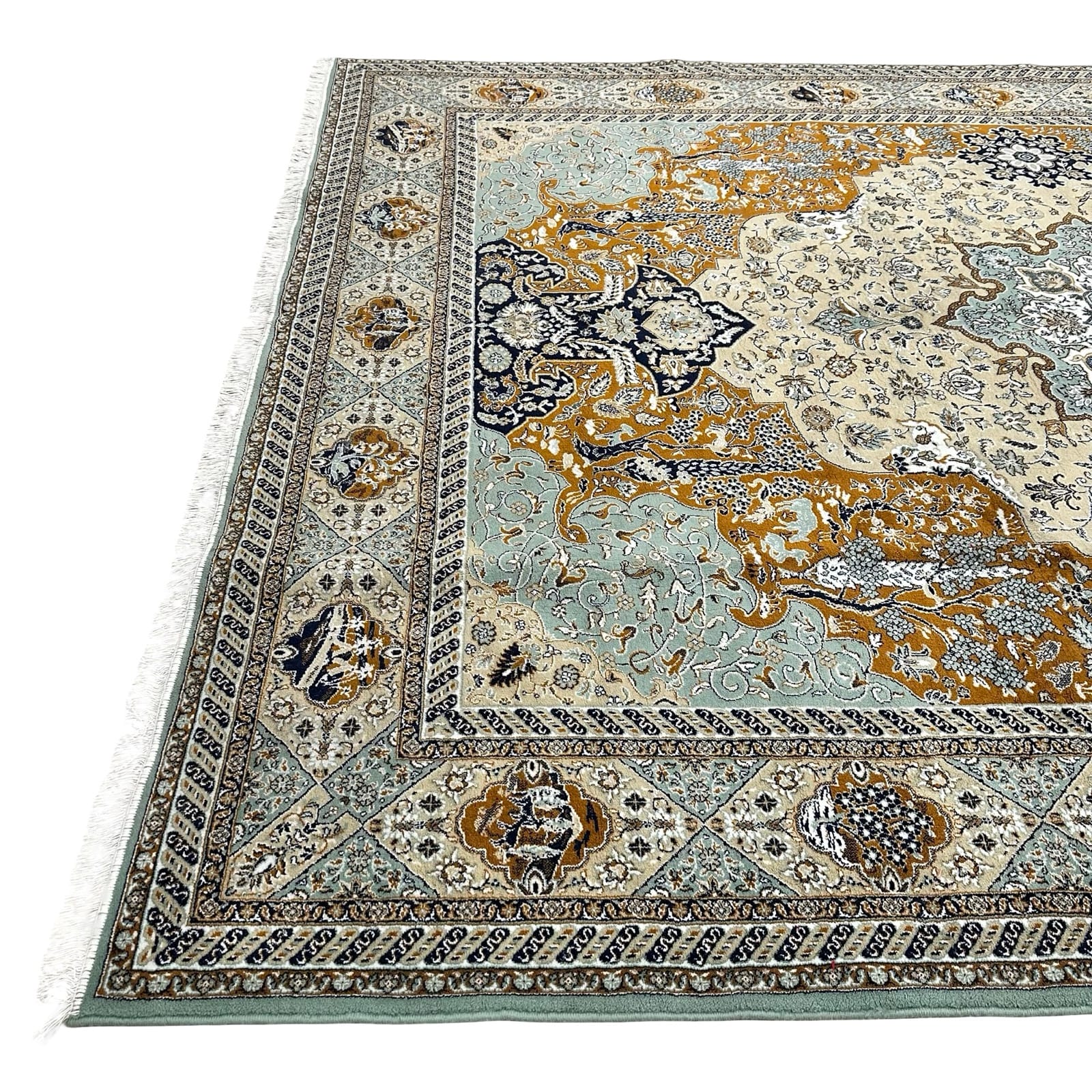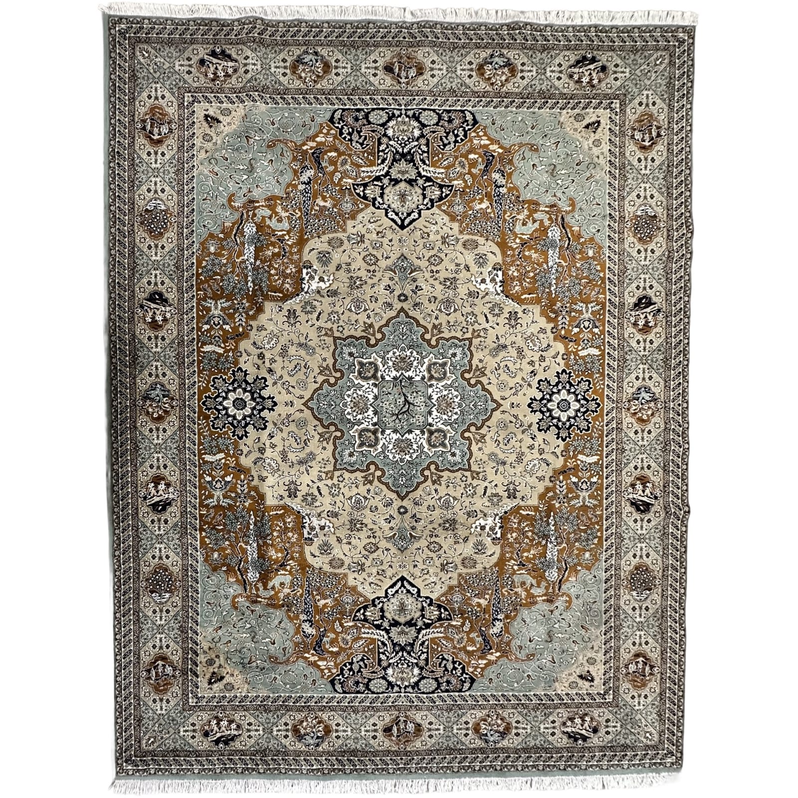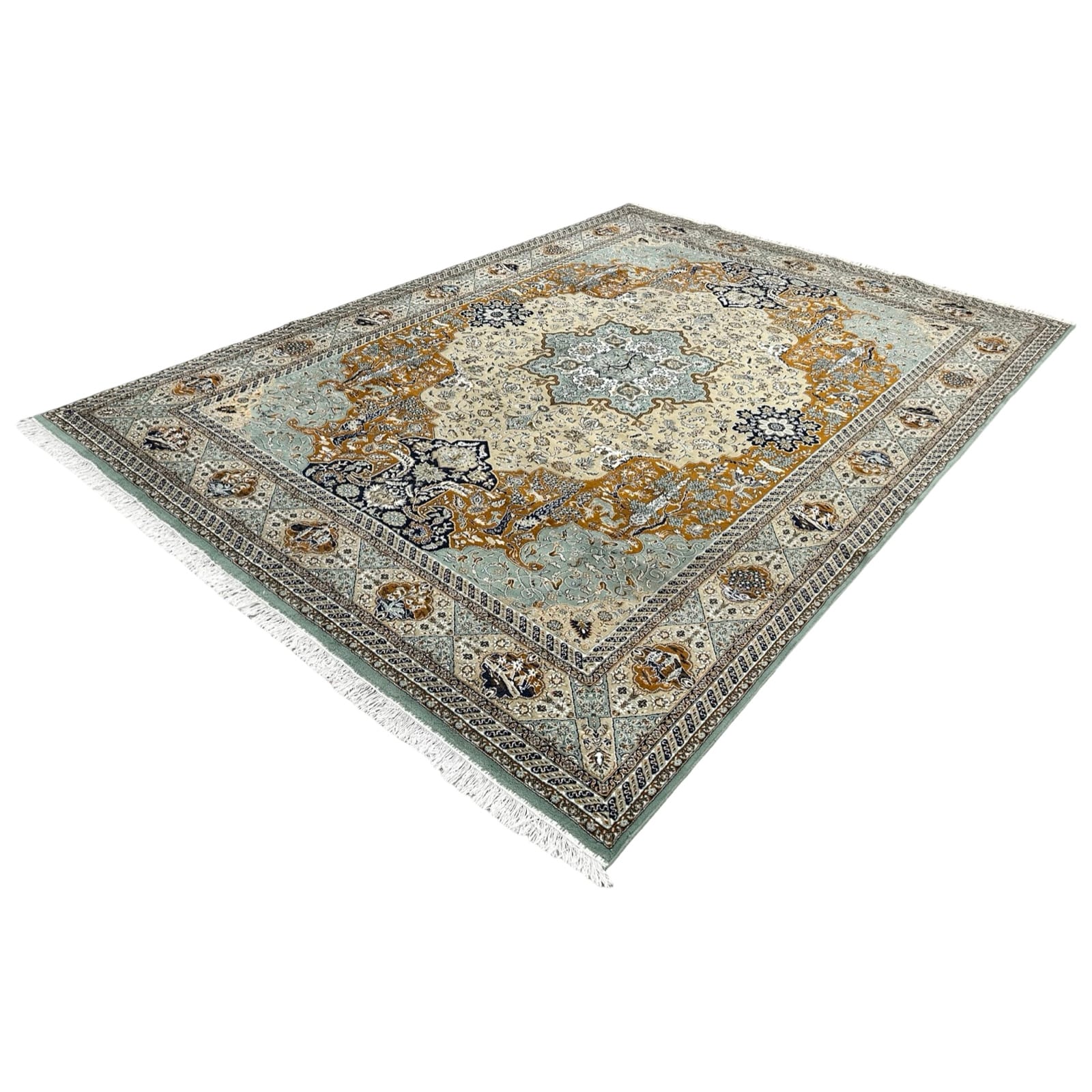 An elegant machine-made Iranian rug crafted from soft synthetic wool with hand-knotted fringes for an authentic Persian finish. It features a detailed medallion design in soothing ivory, teal, grey, and charcoal tones, with fine floral borders that give it a classic, refined look. The pile is smooth, durable, and easy to maintain, making it ideal for everyday use while still carrying the charm of traditional Persian artistry.