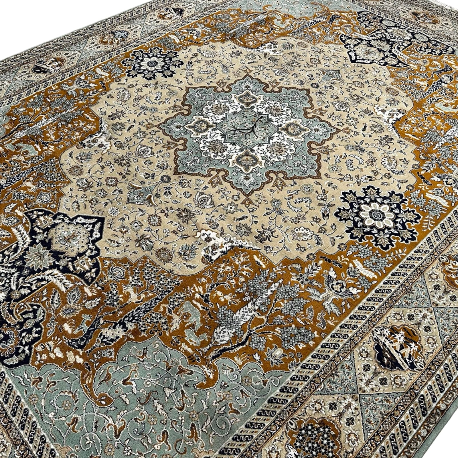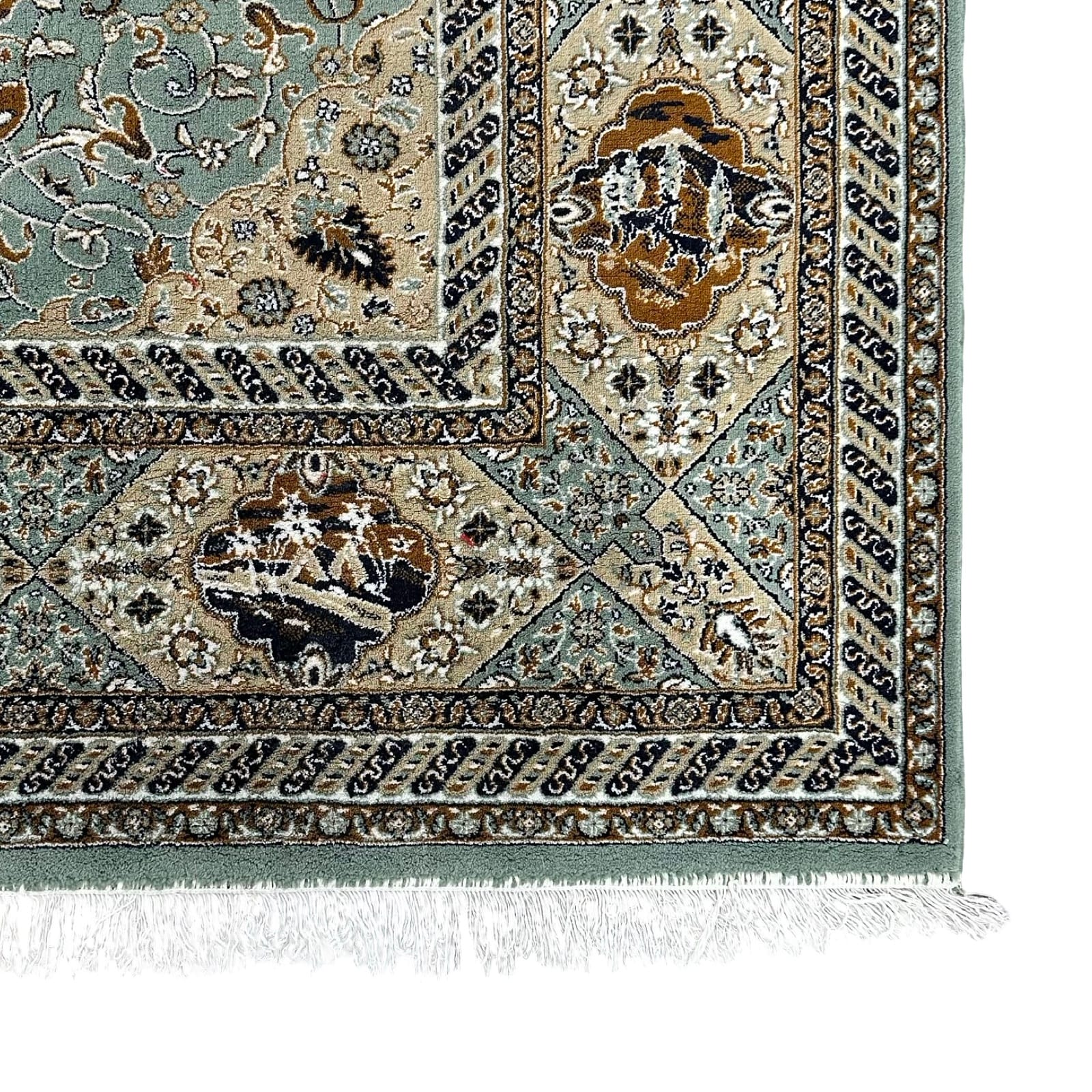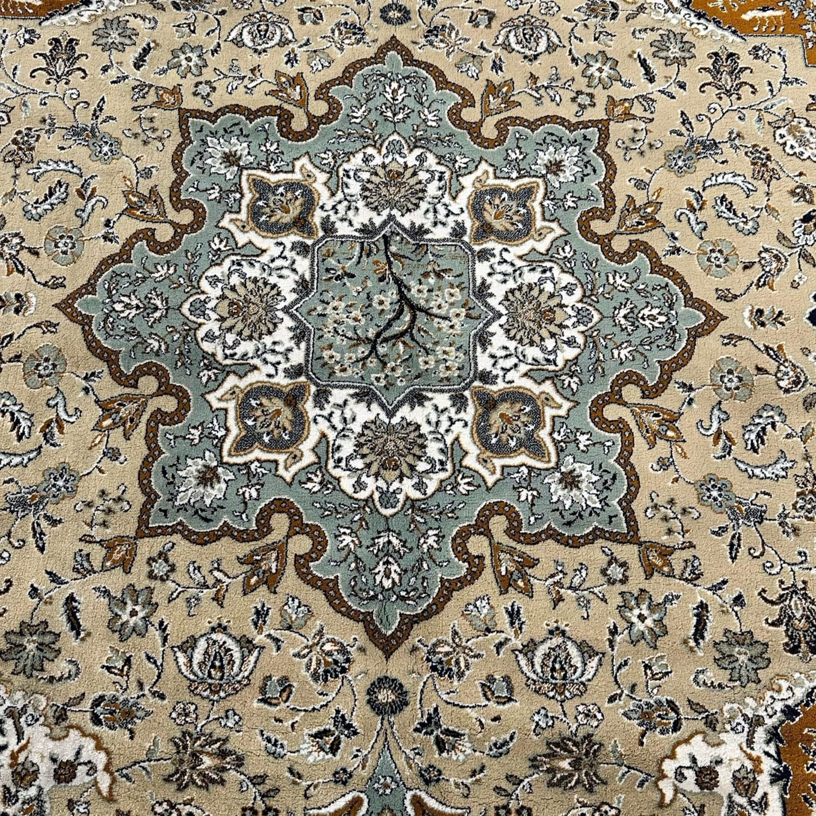 An elegant machine-made Iranian rug crafted from soft synthetic wool with hand-knotted fringes for an authentic Persian finish. It features a detailed medallion design in soothing ivory, teal, grey, and charcoal tones, with fine floral borders that give it a classic, refined look. The pile is smooth, durable, and easy to maintain, making it ideal for everyday use while still carrying the charm of traditional Persian artistry.