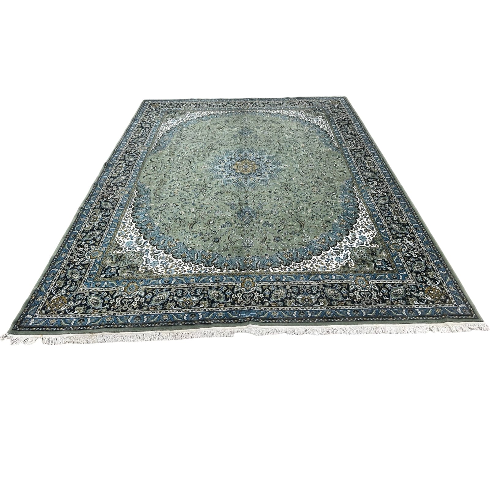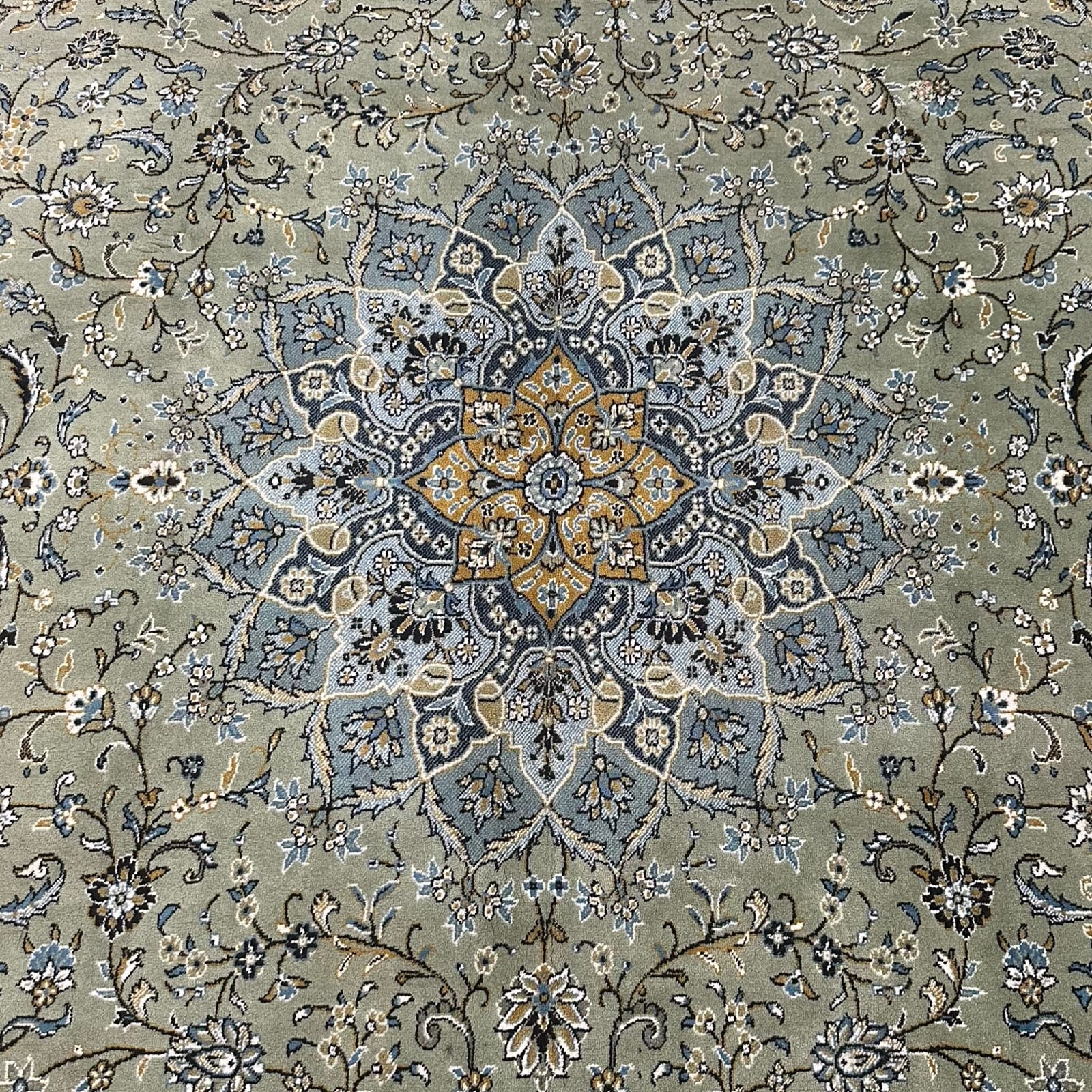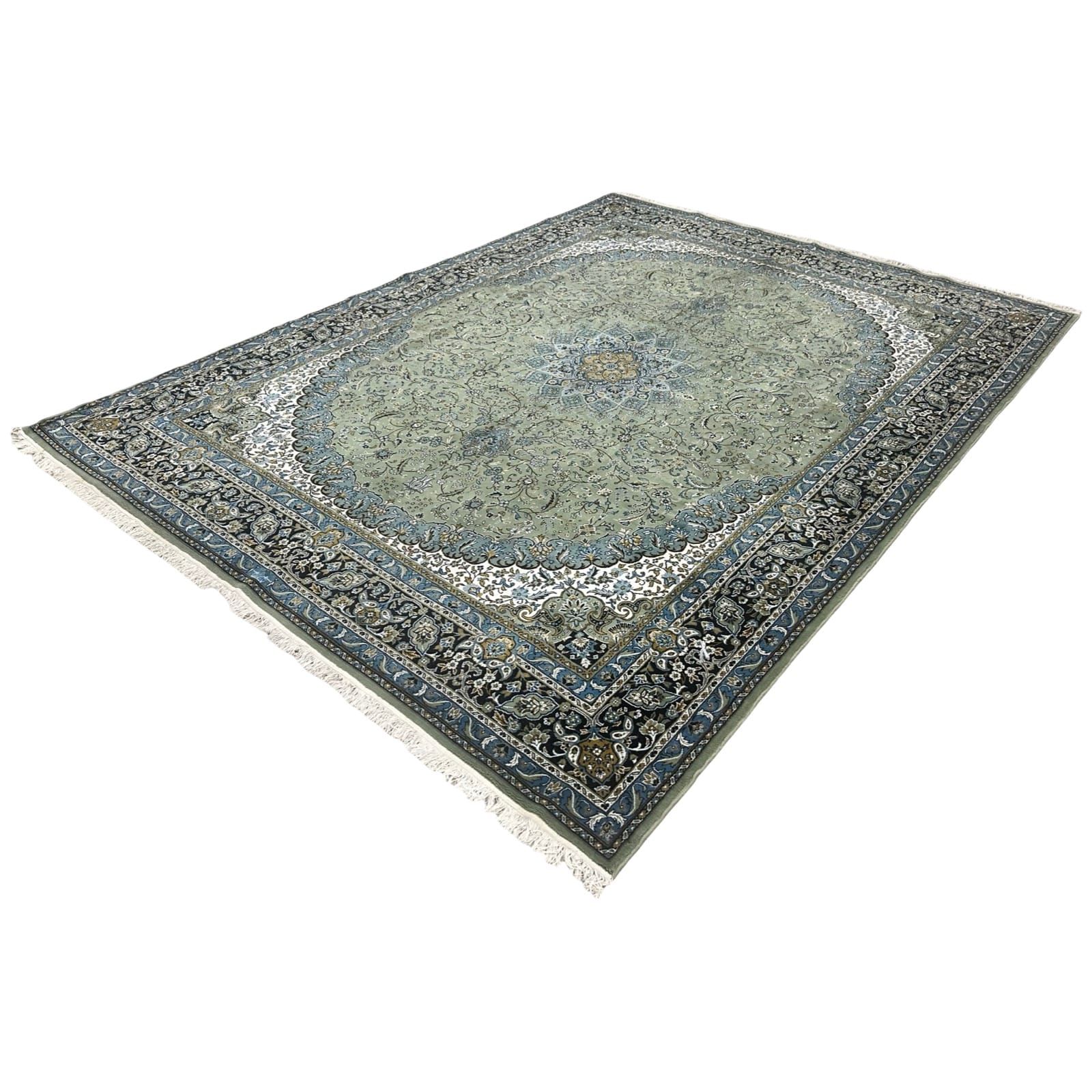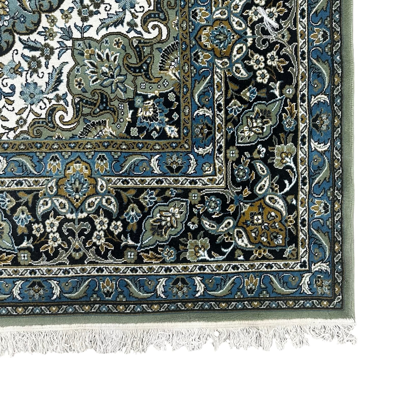 An elegant machine-made Iranian rug crafted from soft synthetic wool with hand-knotted fringes for an authentic Persian finish. It features a detailed medallion design in soothing ivory, teal, grey, and charcoal tones, with fine floral borders that give it a classic, refined look. The pile is smooth, durable, and easy to maintain, making it ideal for everyday use while still carrying the charm of traditional Persian artistry.