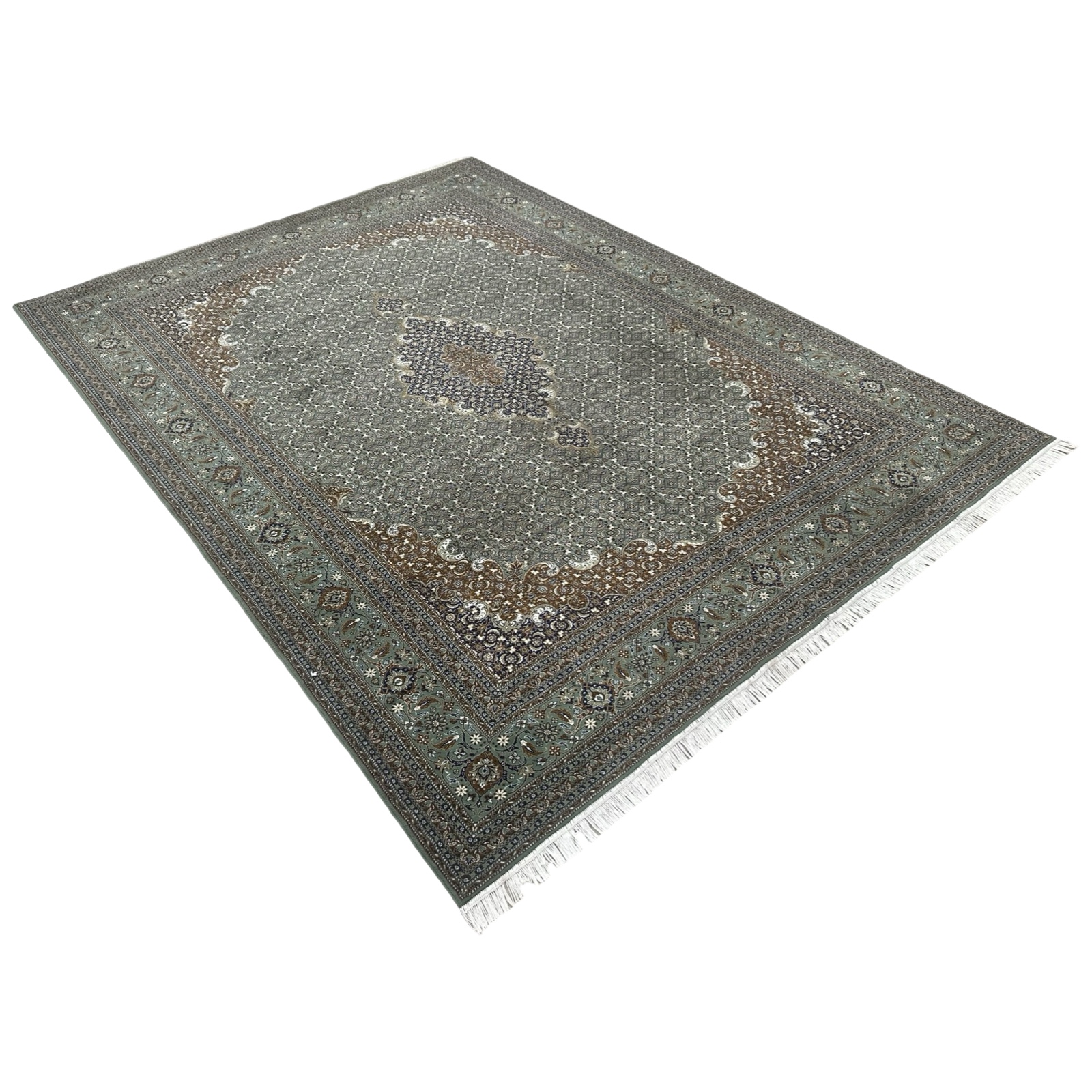 Finished with hand-detailed decorative fringes, it offers the charm of a classic Persian rug with the durability and easy care of modern production. Suitable for living rooms, dining areas, and bedrooms.