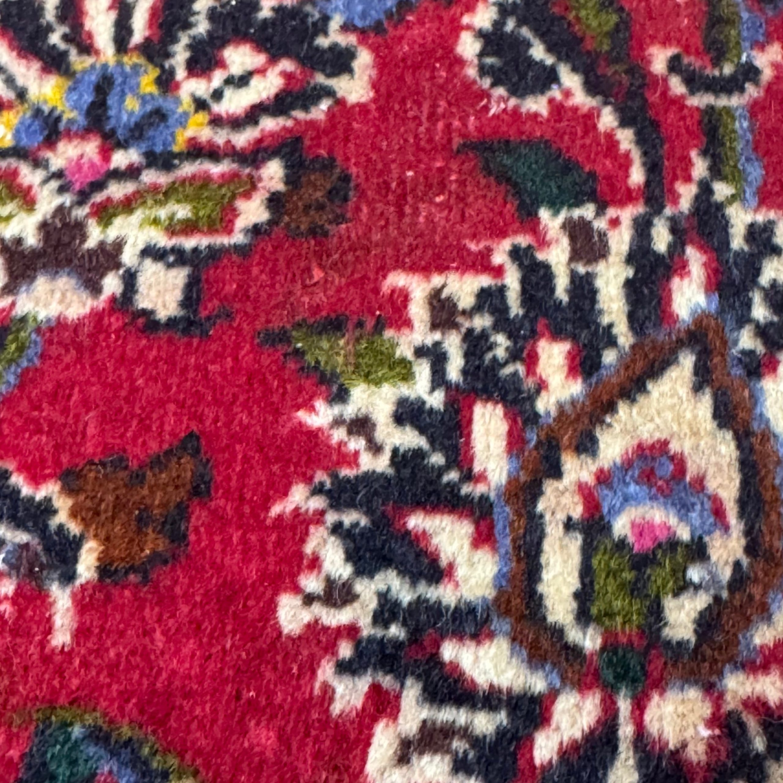 The rug is in good condition with a full pile throughout. The only noticeable characteristic is natural abrash, visible as gentle tonal variations in the red field. This is not damage or wear. It comes from hand-dyed wool and is a sign of authentic, traditional production, adding depth and character rather than detracting from the rug.