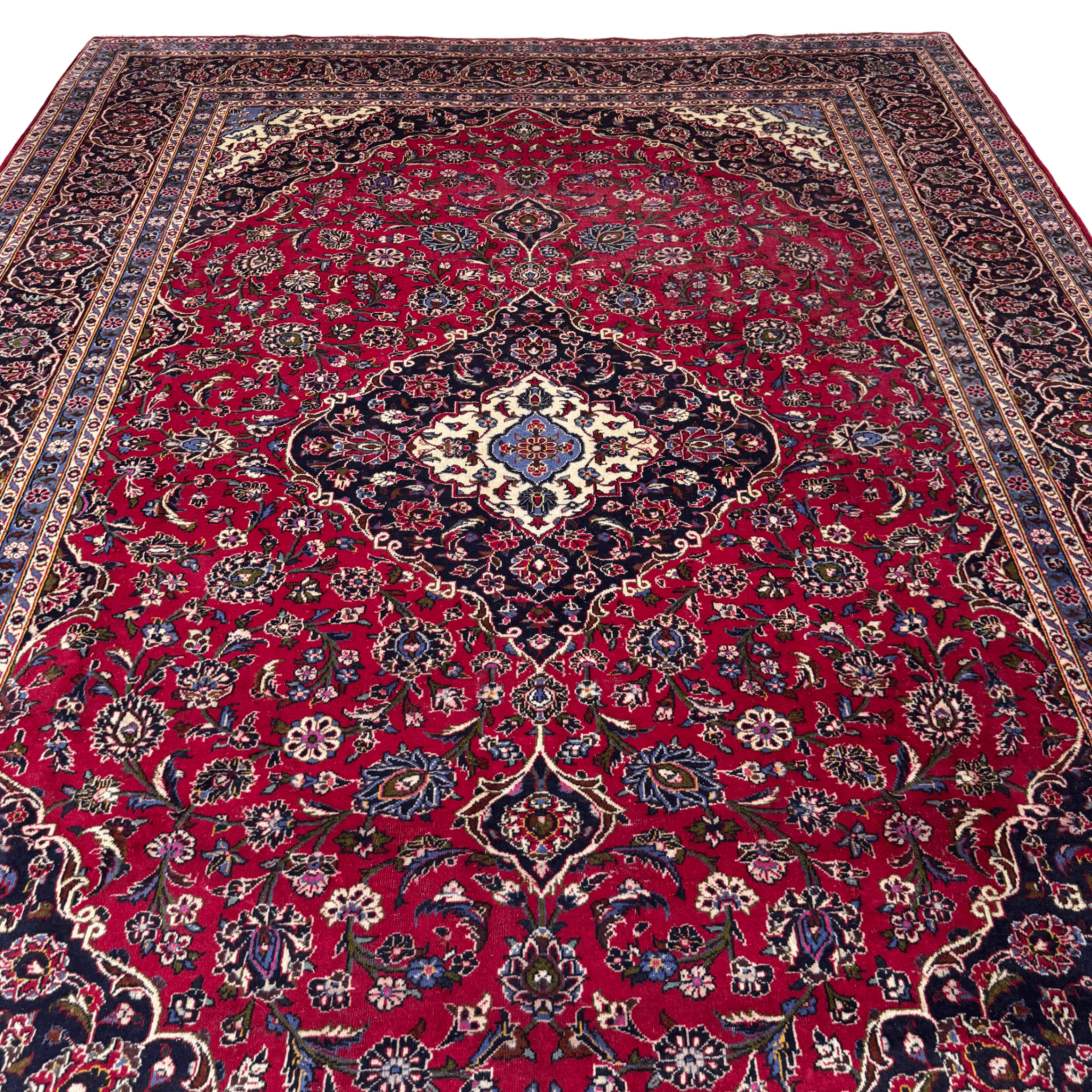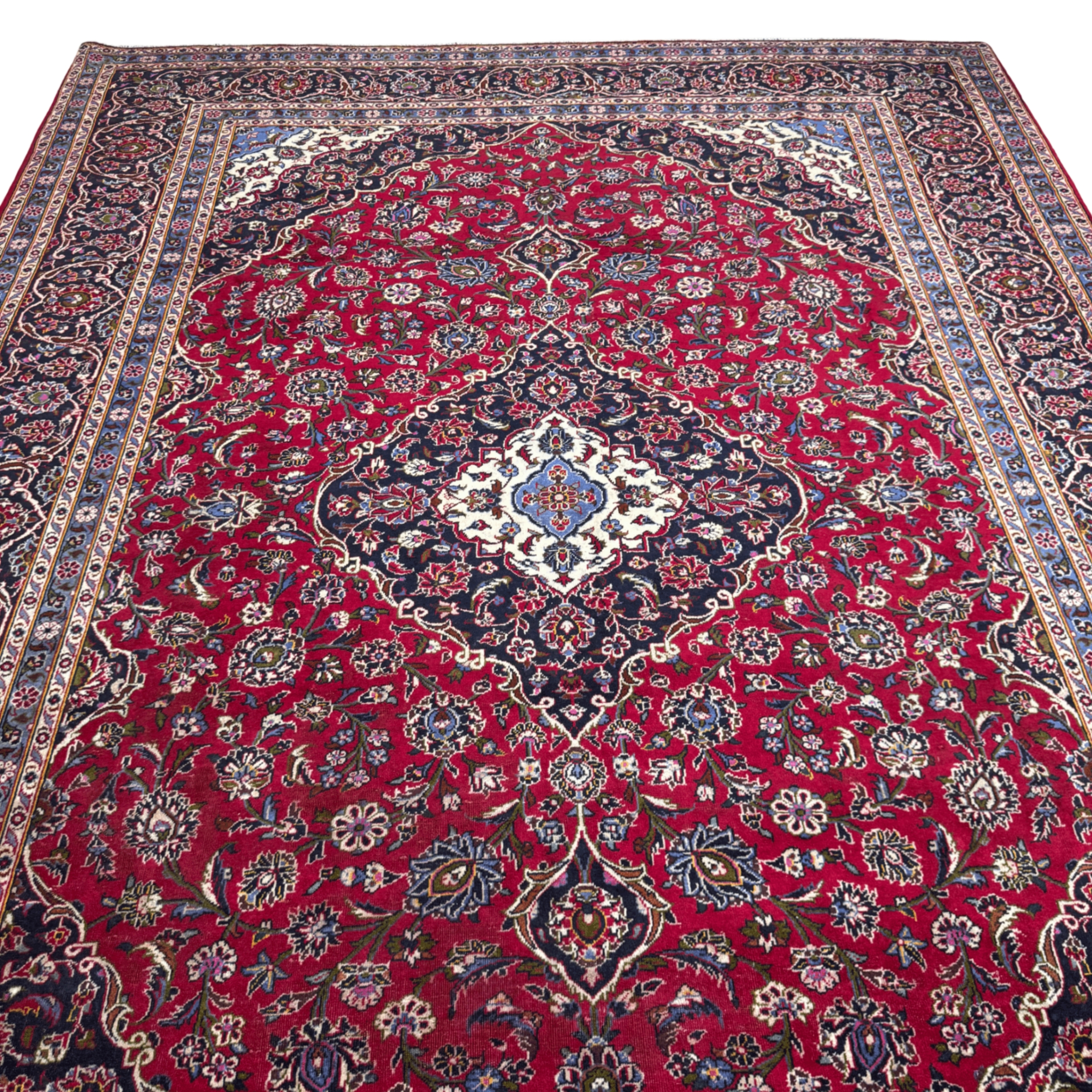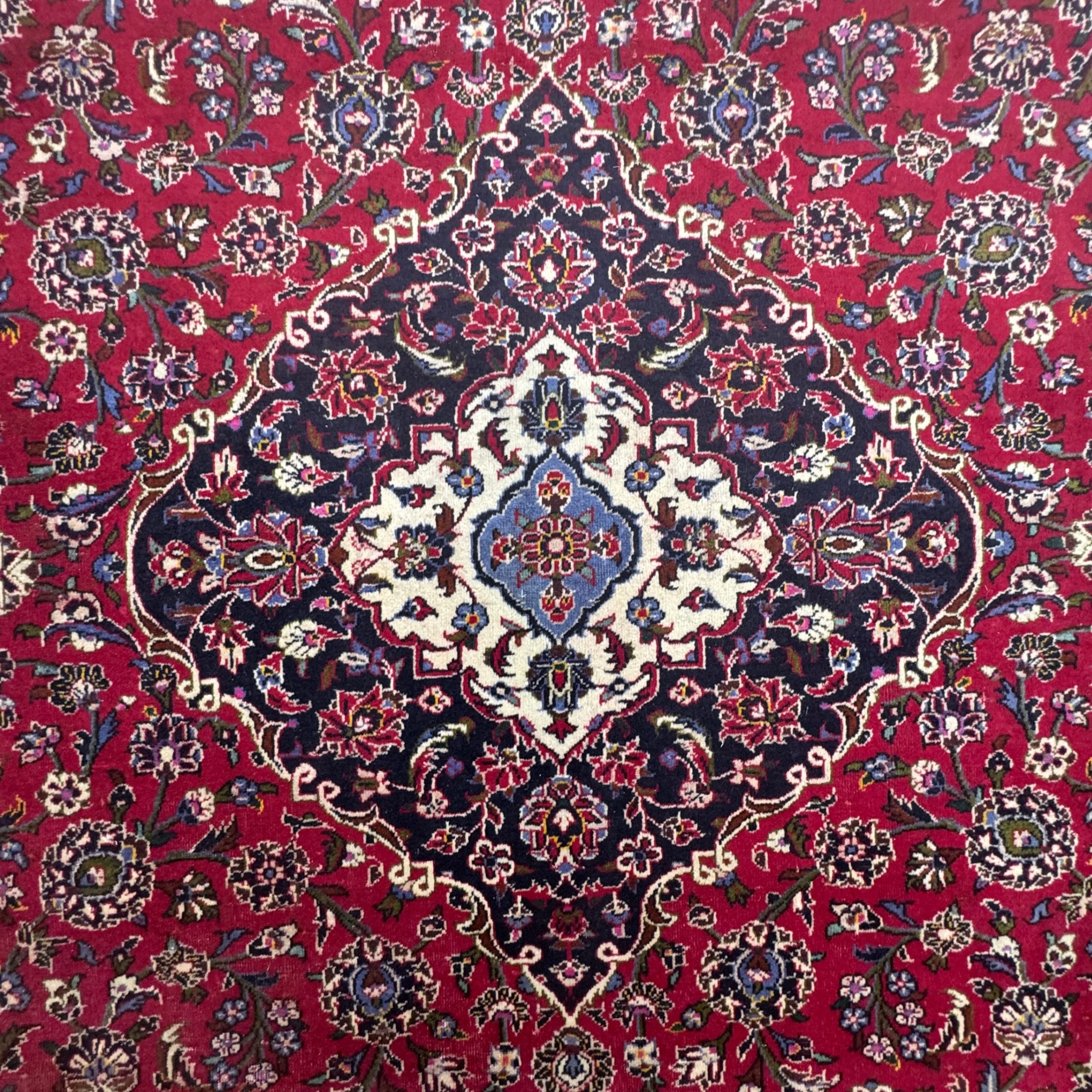 This is a classic red Kashan carpet, hand-knotted in Iran using high-quality wool. It features the traditional Kashan layout with a strong central medallion, dense floral detailing, and deep navy borders that frame the rich red field beautifully. The drawing is refined and well balanced, which is typical of good Kashan workshop pieces.