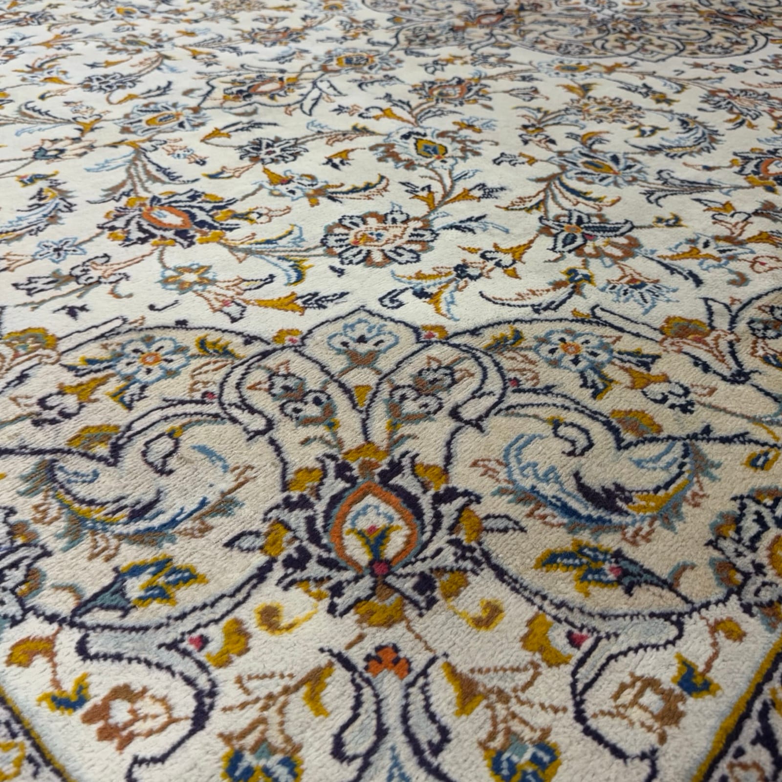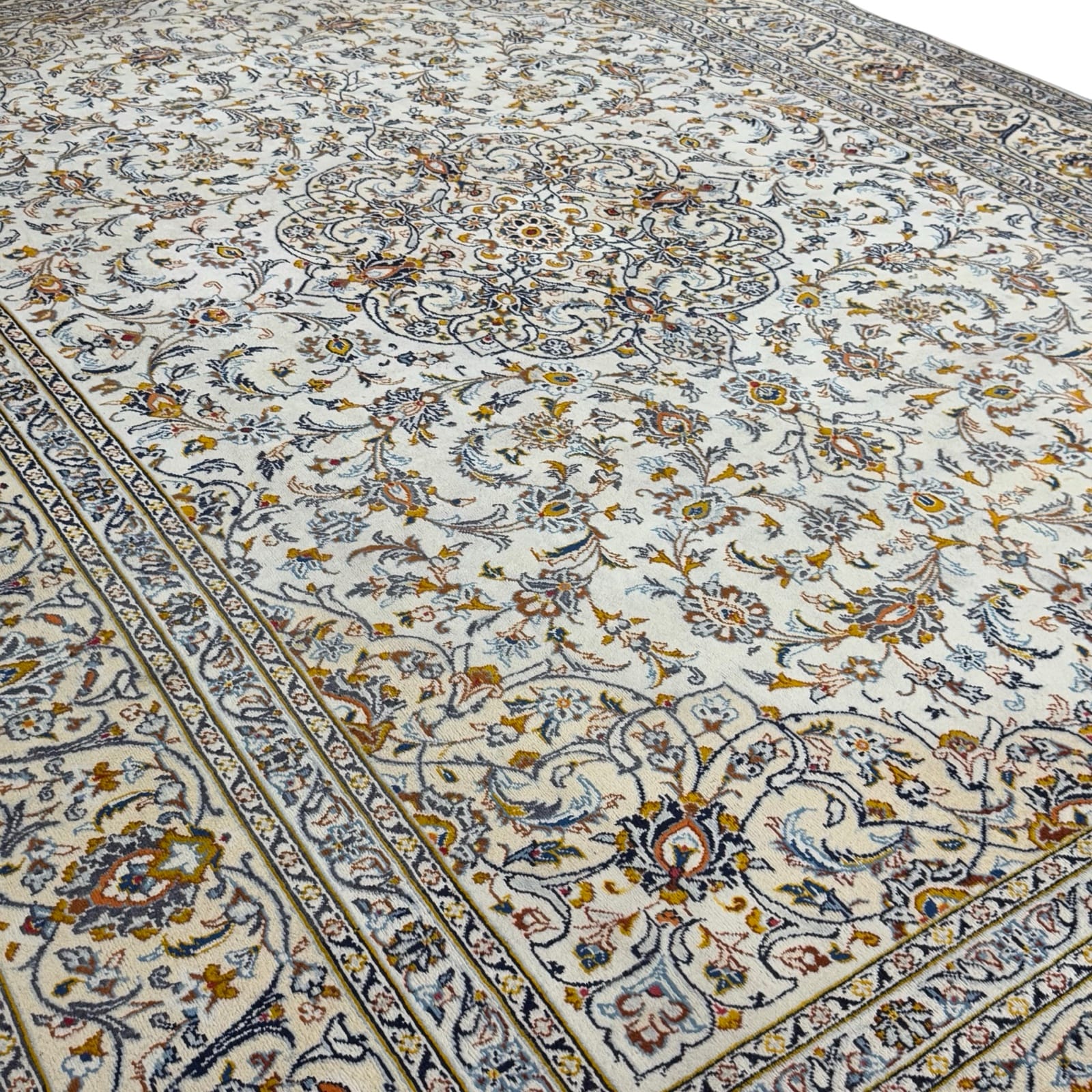 406 x 300cm Hand-Knotted Persian Kashan Rug – Ivory & Blue Tones